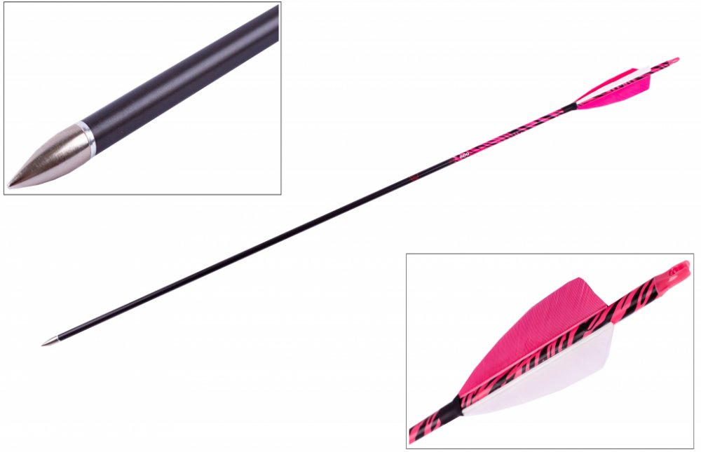 Kvalitní karbonový šíp do luku s výměnným hrotem délky 30", dekor zebra, spine 600, průměr šípu 7 mm. Sytě růžové letky natural z krocaního peří. Šíp v barvě karbonu s pruhovaným vzorem.