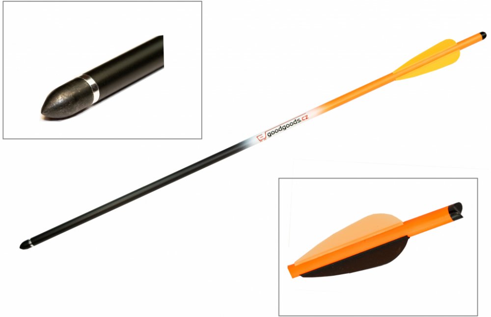 Kvalitní karbonový šíp do kuše s výměnným hrotem délky 16" což je 40,6 cm. Průměr šípu 9 mm. Šíp výrazné barvy.