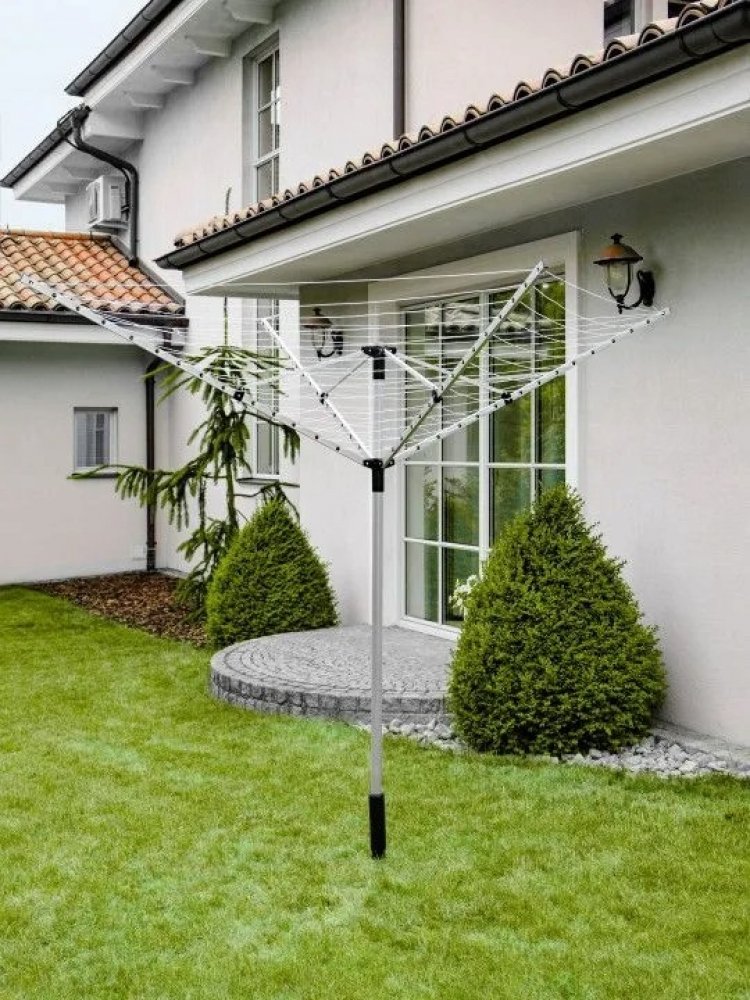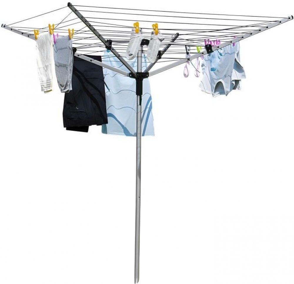 Velká zahradní sušička má prostor pro zavěšení 60m prádla. Silná konstrukce z hliníku zajišťuje odolnost vůči povětrnostním podmínkám. Lana jsou zavěšena mezi čtyřmi hliníkovými rameny. Sušička má možnost nastavení výšky sušení. Sušičku lze rychle rozebrat a složit a její konstrukce umožňuje libovolné otáčení. Sada obsahuje vrtačku pro instalaci do země a kryt.