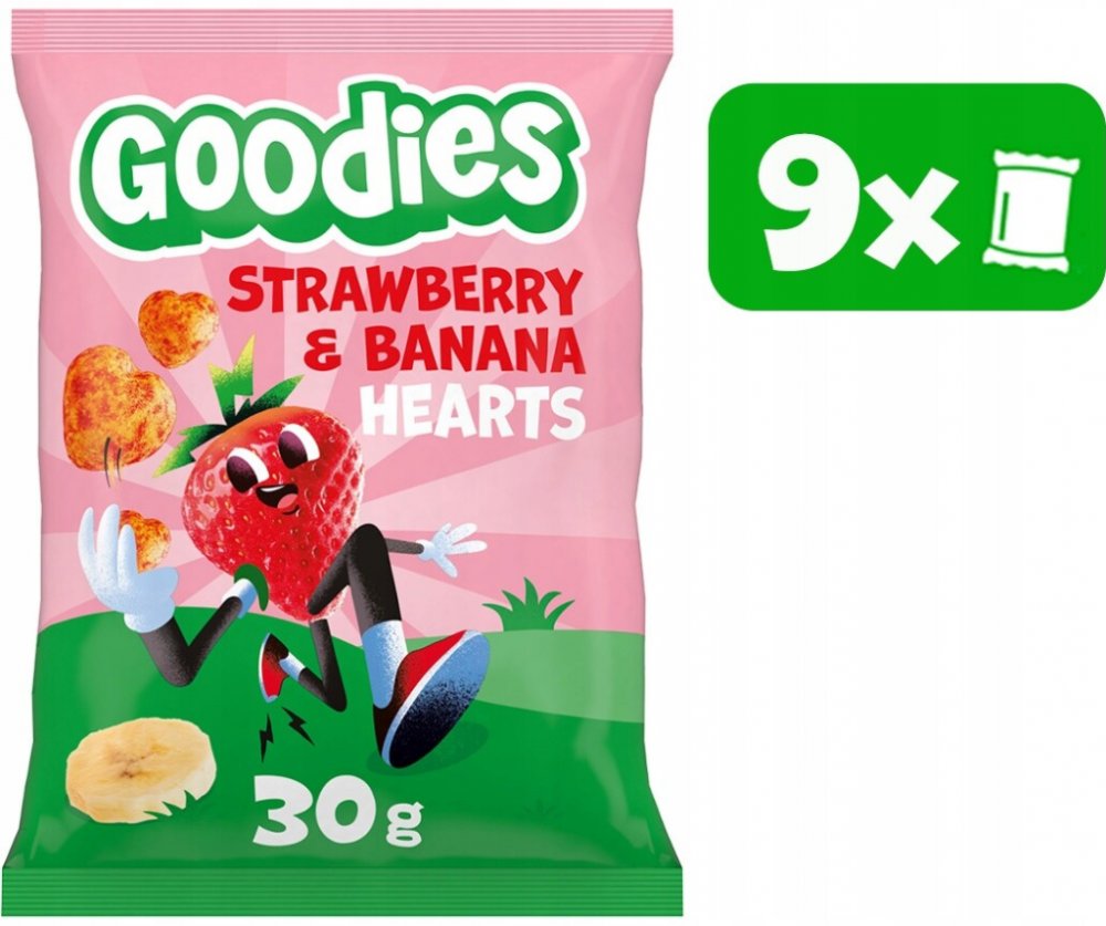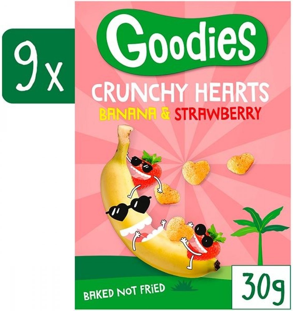 Křupky pro děti Goodies srdíčka s banánem a jahodouGoodies křupky srdíčka banán a jahoda jsou hravé křupky obalené v prášku z mrazem sušeného ovoce. Žádné přidané cukry, plno skvělé chuti. Křupavá svačinka, ideální na cesty nebo do svačinkových boxíků. V křupkách pro děti Goodies očekávejte banánové a jahodové složky. Vhodné pro malé strávníky od 3 let.Od 3 letVhodné od9× 30 gVelikost baleníKřupky...