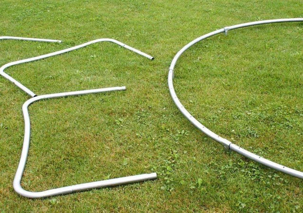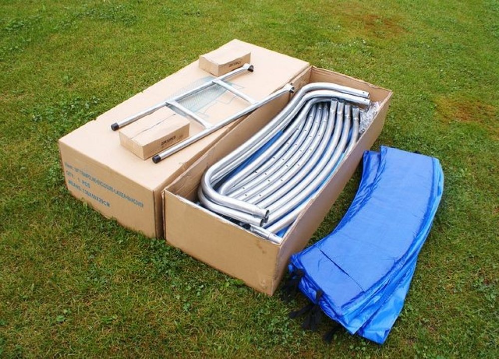nohy trampolíny - tzv. "U" nohy: 4 ks, uvnitř a vně pozinkované 38 mm × 1,5 mm (silná konstrukce nohou trampolíny poskytuje dostatečnou stabilitu)