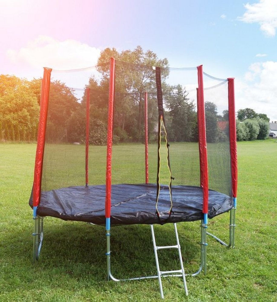 Červená trampolína 305 cm s ochrannou sítí, žebříkem a navíc i krycí plachtou je kvalitní trampolína certifikovaná společností Intertek.