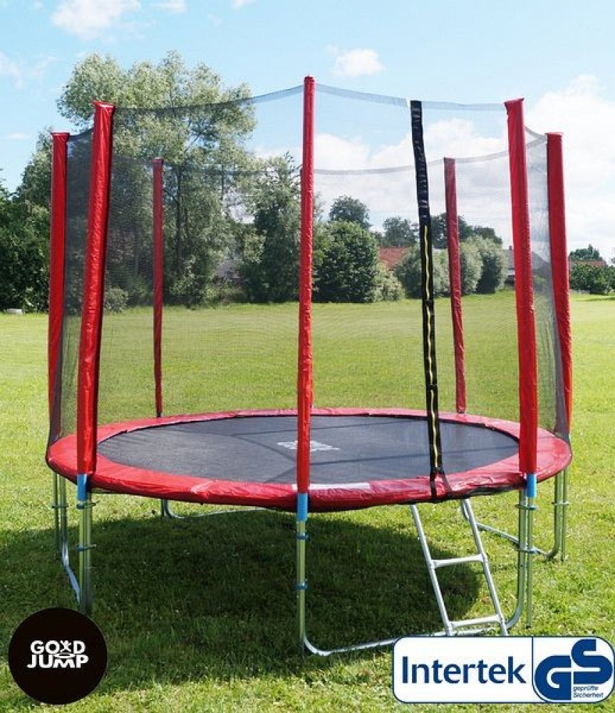 Modrá trampolína značky GoodJump 366 cm s vnitřní ochrannou sítí a žebříkem je vyrobená z prvotřídních materiálů a navíc je opravdu bezpečná, což potvrzuje certifikace společnosti Intertek.