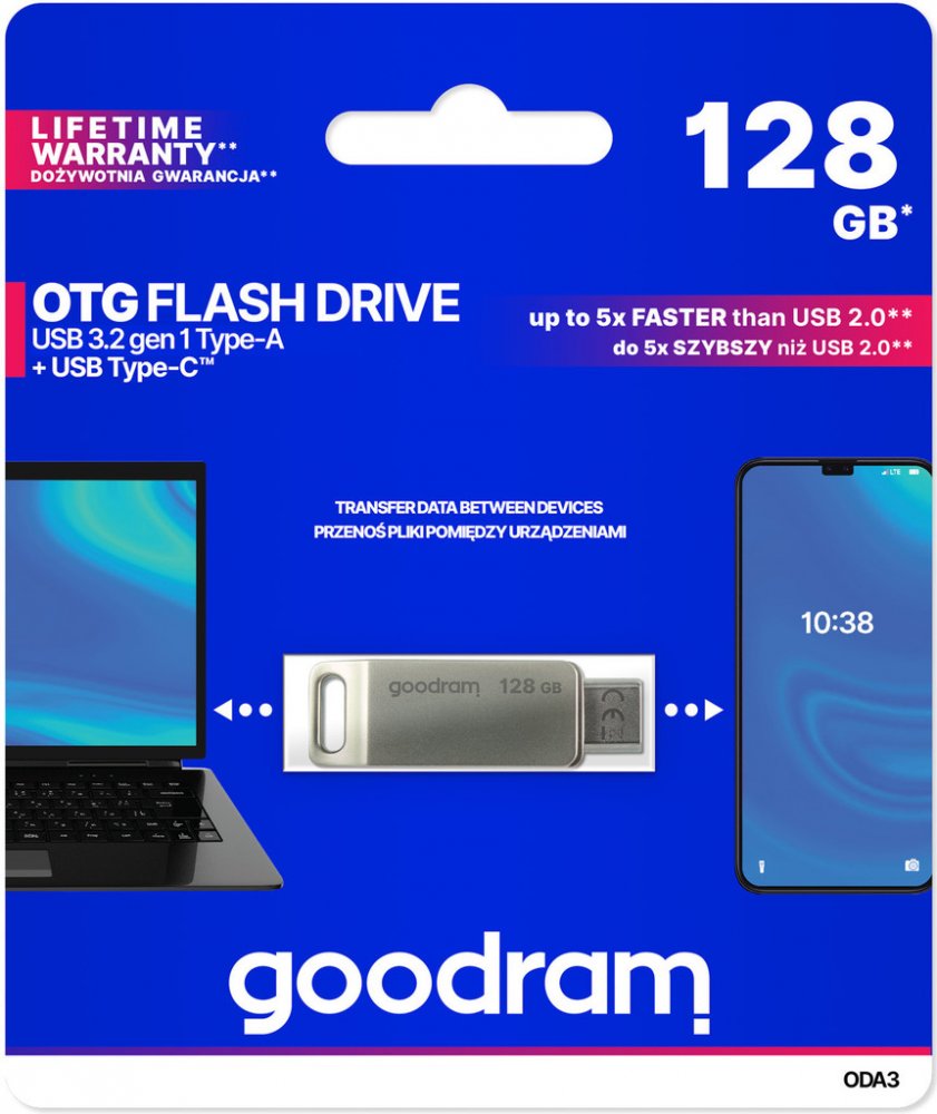 Type-C™ is becoming the most popular USB type used to transfer data between all electronic devices. The growing popularity of this solution is supported by the fact that manufacturers of next gen laptops, smartphones, PCs and other devices are increasingly equipping their products with an additional “C” next to the standard type A connector or choose only Type-C™. GOODRAM OTG ODA is an excellent solution that will work both with an old and new electronic devices generation laptops, smartphones and PCs. The ODA Flash drive is equipped with two fast USB 3.2 connectors: one standard type A and the Type-C™, which means that data transfer between devices of different generations has never been so easy and fast.