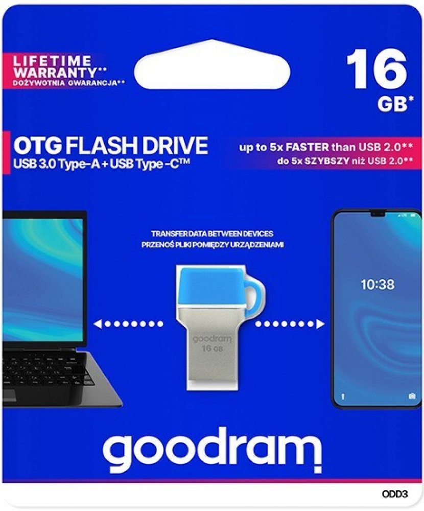 GOODRAM ODD3Kompaktní USB Flash disk s podporou USB On-the-Go, vám umožní rychlý přenos dat mezi počítačem a vašim smartphonem bez jakéhokoli kabelu. SPECIFIKACE:* funkční, kovový kryt s gumovým víčkem* voděodolný, otřesuodolný* dostupné v kapacitách: 16, 32, 64 GB* rozhraní: USB 3.
