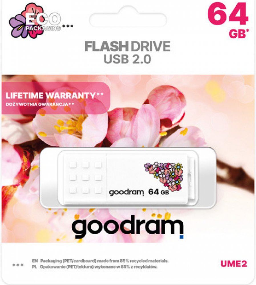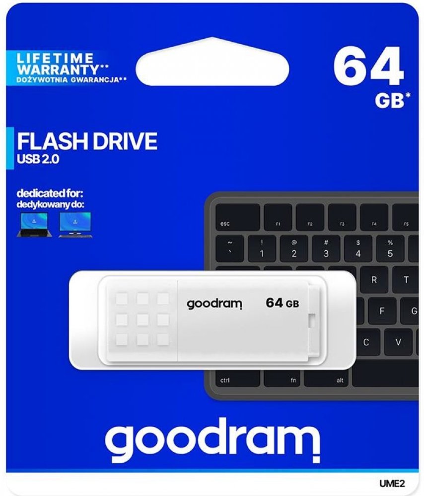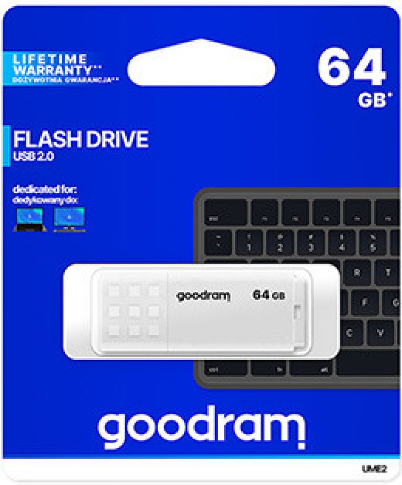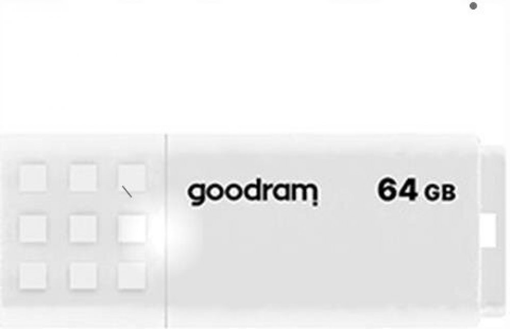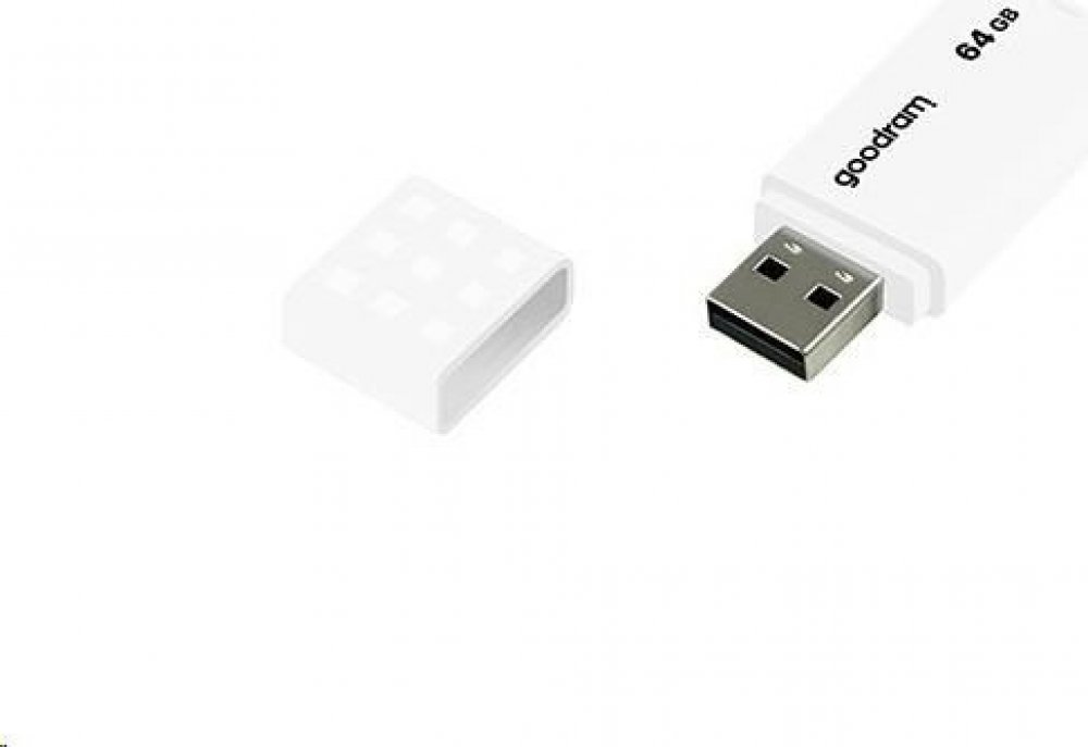 GoodRam 64 GB USB 2.0 20 MB/s 5 MB/s USB-A s jedním konektorem se základní rychlostí 9 g plastové bílé 10 mm 55 mm 21 mm s odnímatelným víčkem se standardní odolností
