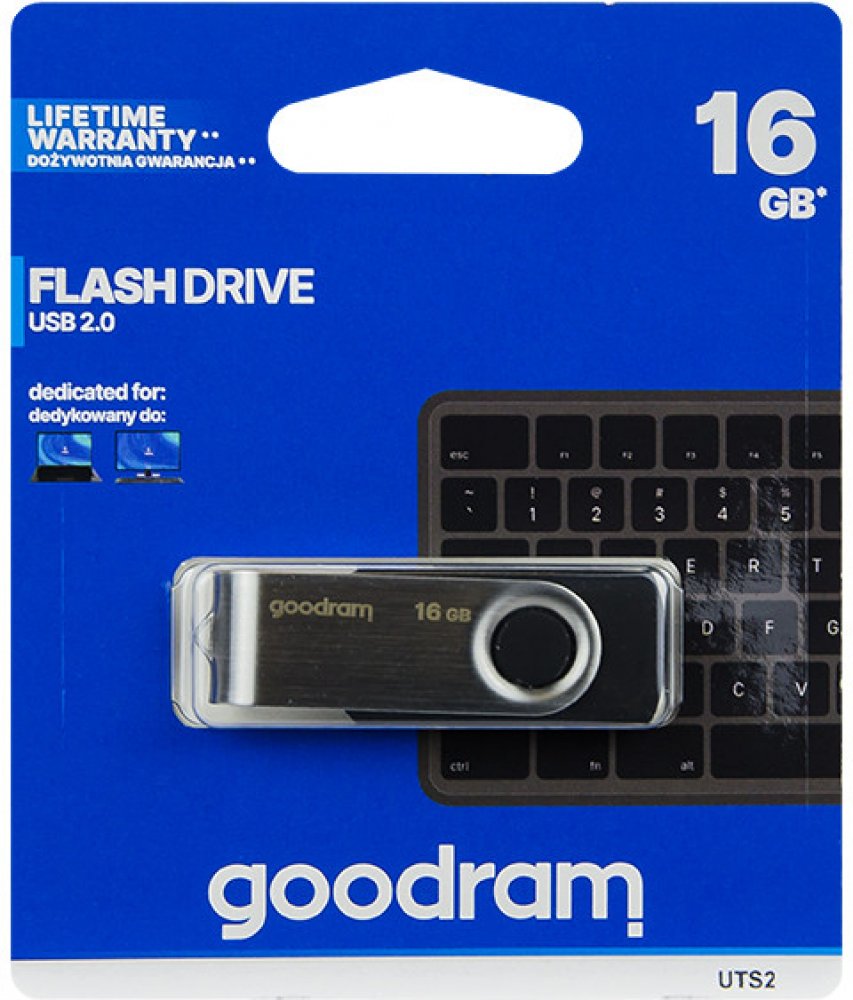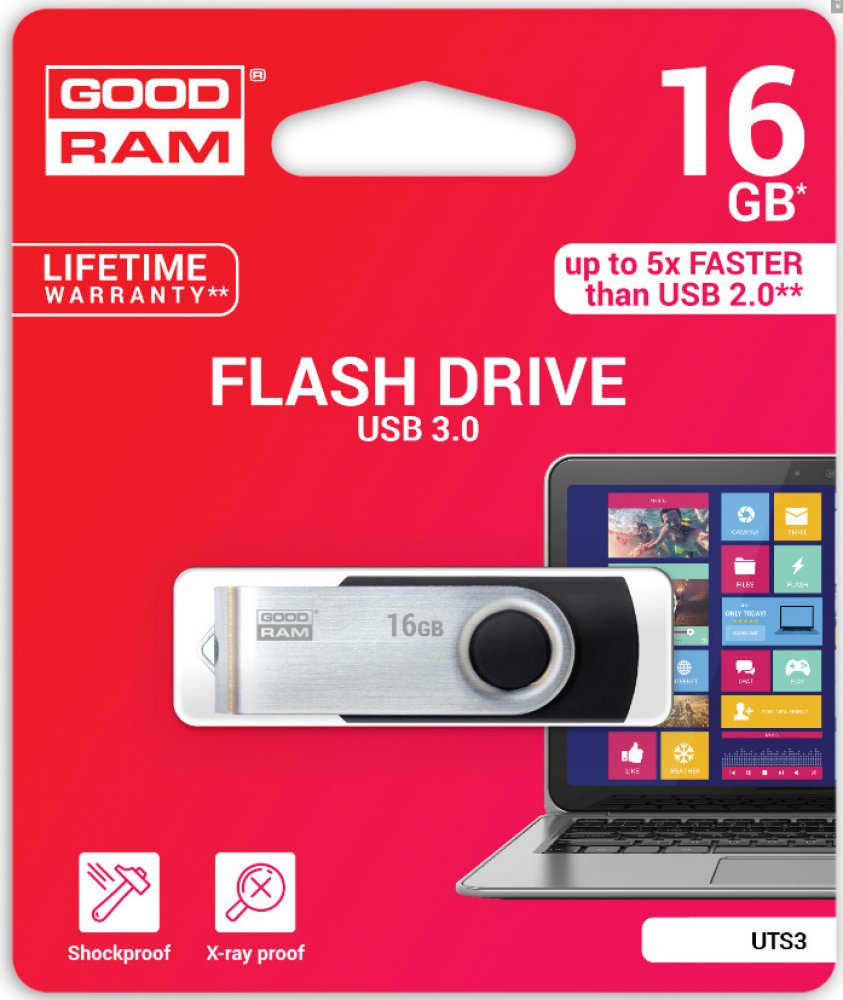 Univerzální a funkční flash disk GOODRAM UTS2. Odolné plastové pouzdro s otočným kovovým krytem chrání vaše data. Nemusíte se obávat ztráty zástrčky díky unikátnímu designu.