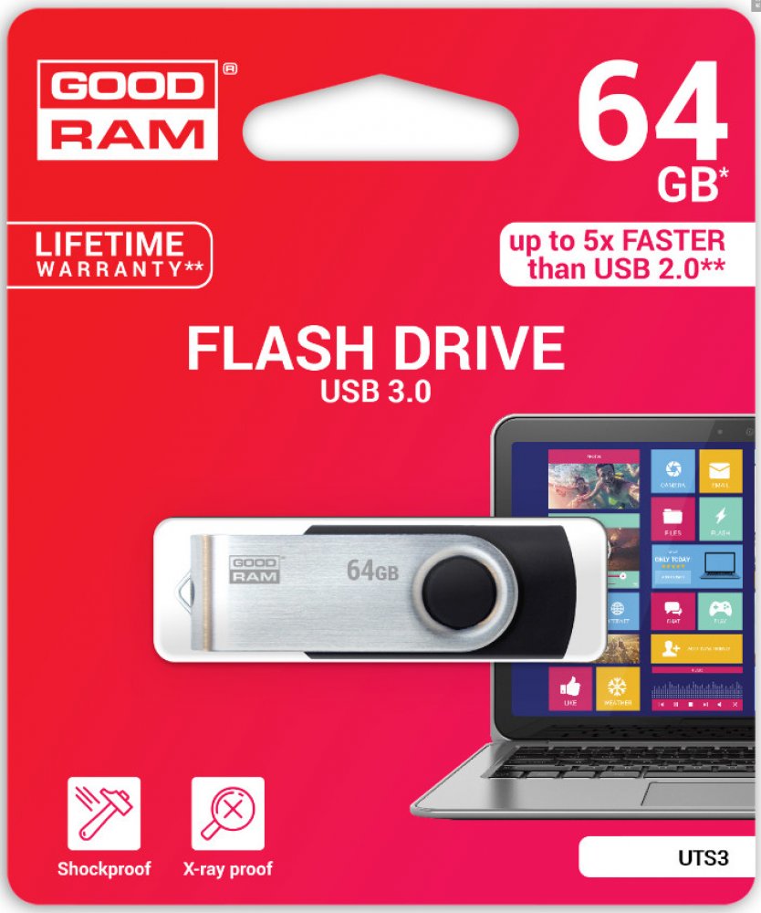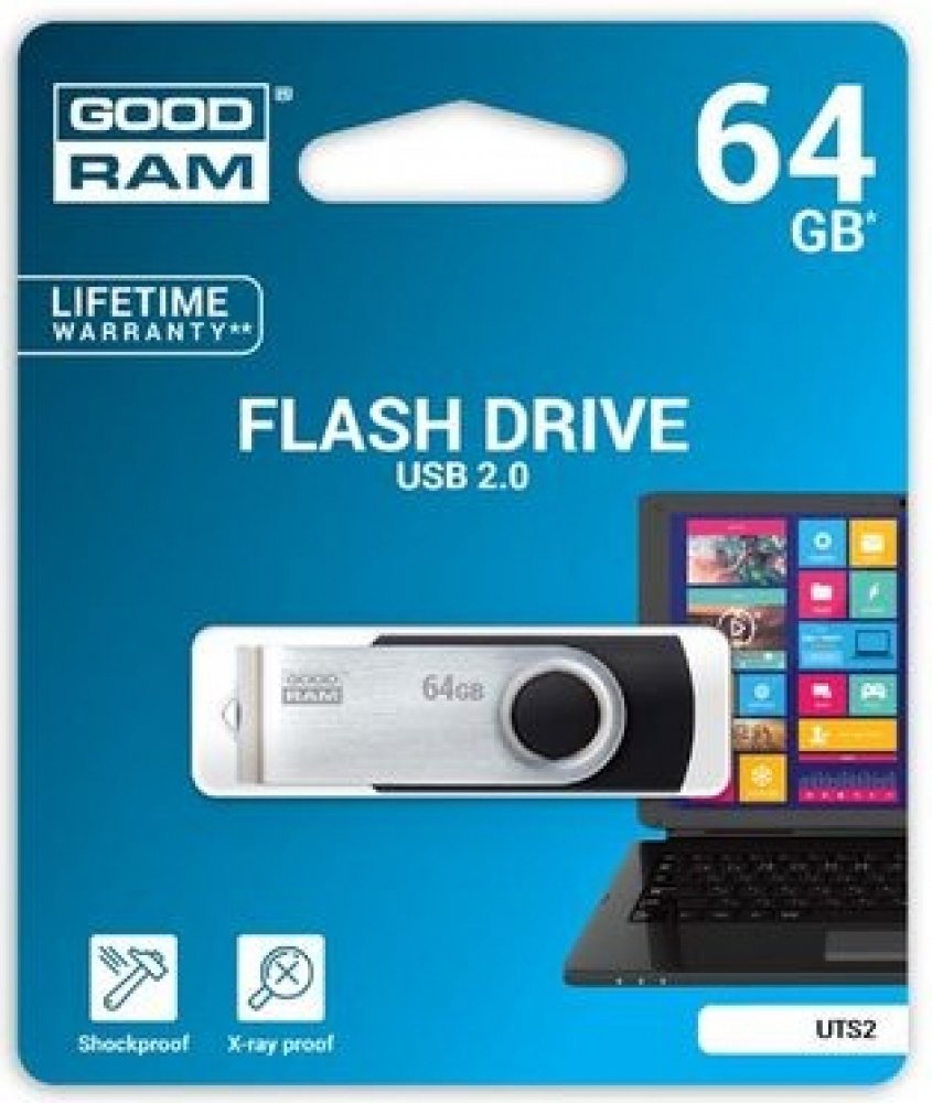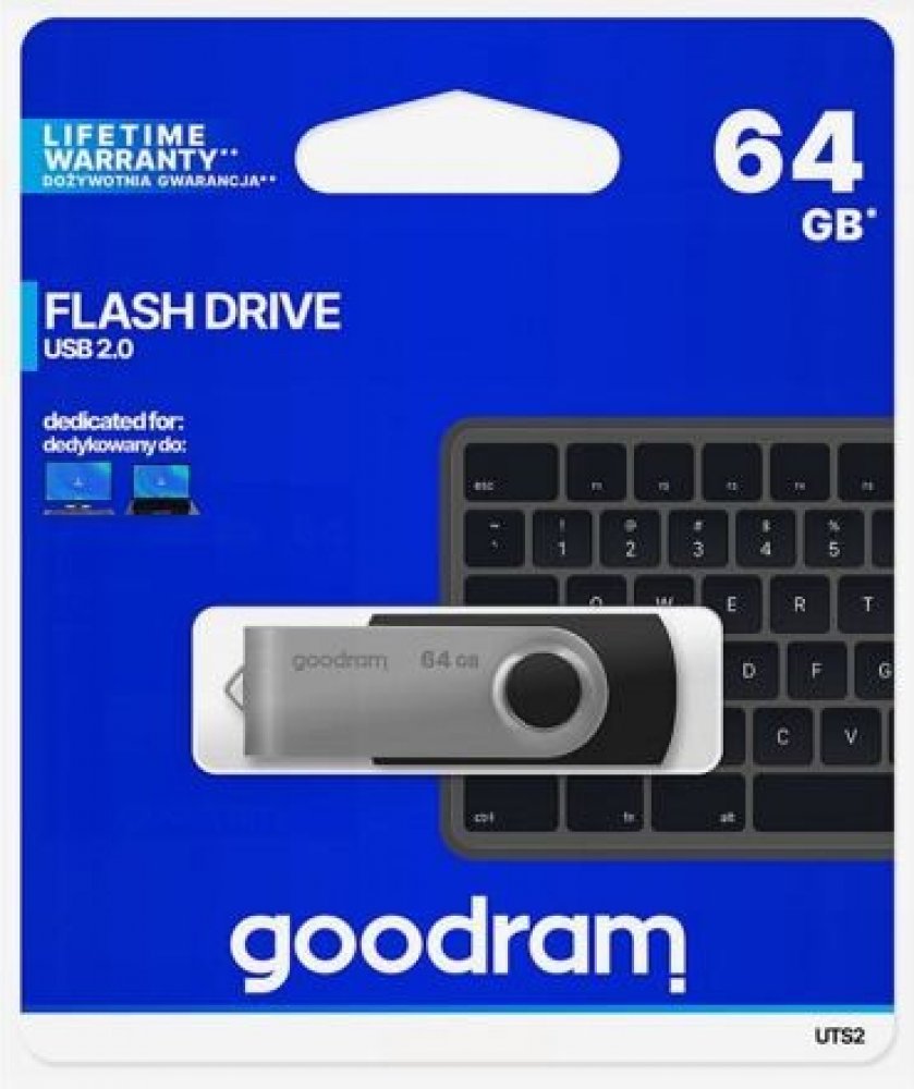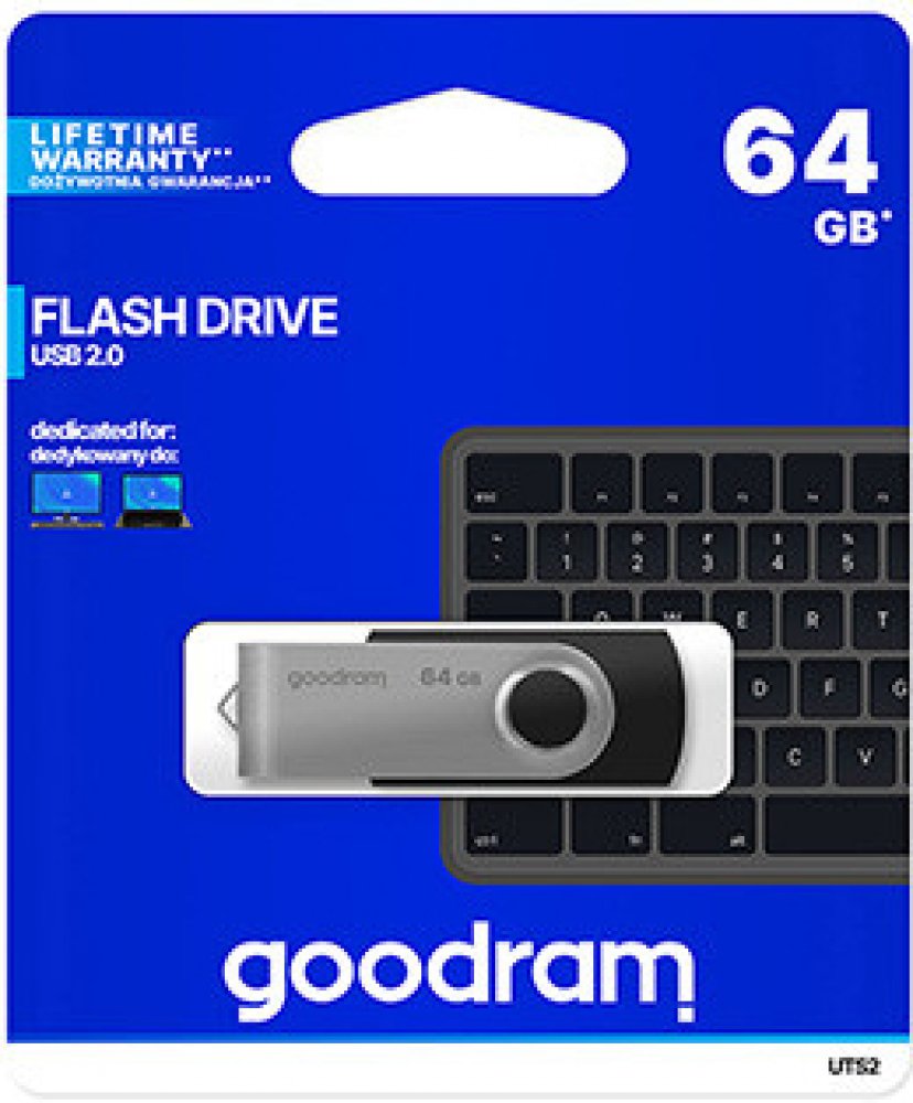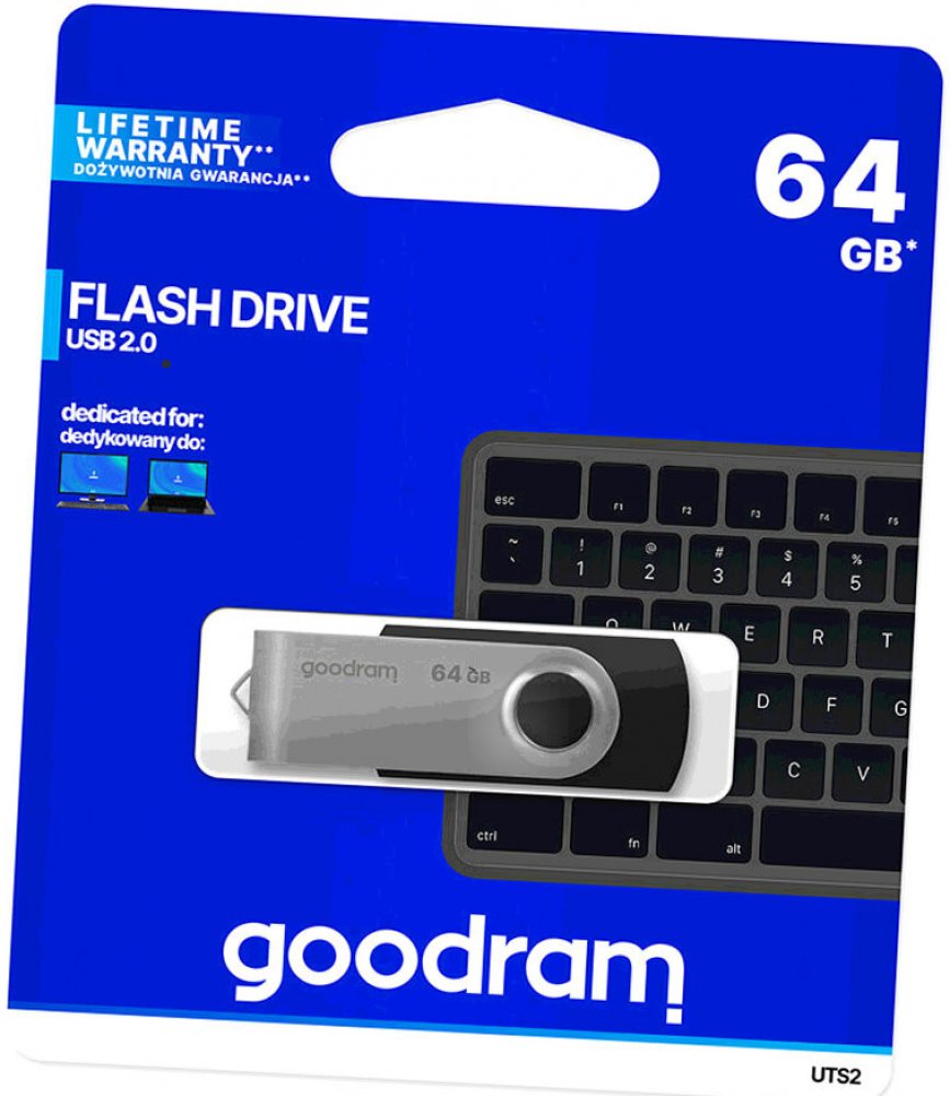 UTS2 USB 2.0 Versatility and functionality are the most important features of UTS2. The durable housing with rotatable metal cover not only protects the stored data, but also ensures that there is no need to worry about lost plugs. UTS2, unlike similar products available on the market, is characterized by branded components and a lifetime warranty. Available capacities:4, 8, 16, 32, 64, 128 GB Available colors: black, blue USB 2.0 interface lifetime warranty + technical support A classic solutionUTS2 housing is made of durable plastic. Thanks to the wide range of colors, each model is unique. An additional advantage is the rotating metal cover, which protects the flash drive and gives it a unique look. Always by your sideThe classic housing of UTS2 makes it popular among the supporters of practical solutions. The practical design of UTS2 makes it easy to attach it to a lanyard, allowing it to be used at any time. The rotary locking system and the lack of cap will allow even the most absent-minded users to enjoy the flash drive for a long time. Solid housingUTS2 housing is made of durable plastic. Thanks to the wide range of colors, each model is unique. An additional advantage is the rotating metal cover, which protects the flash drive and gives it a unique look. TECHNICAL SPECIFICATIONS Capacity 64 GB Color Black Interface USB 2.0 type A backwards compatible with USB 1.1 Speed of operation read: up to 20 MB/swrite: up to 5 MB/s Power supply USB port Operating temperature 0 - 70°C (recommended) Storage temperature -25 - 85°C (recommended) Operating and storage humidity 5 ~ 95% (recommended) ReadyBoost function Supported Compatibility with OS Windows 2000 SP4 and newer, MacOS 10.5.x and newer, Linux v.2.6.x and newer Dimensions 57.1 x 19.3 x 10.7 mm Weight (without packaging) 15 g Blister dimensions (W x H) 103 x 123 mm Warranty Lifetime .