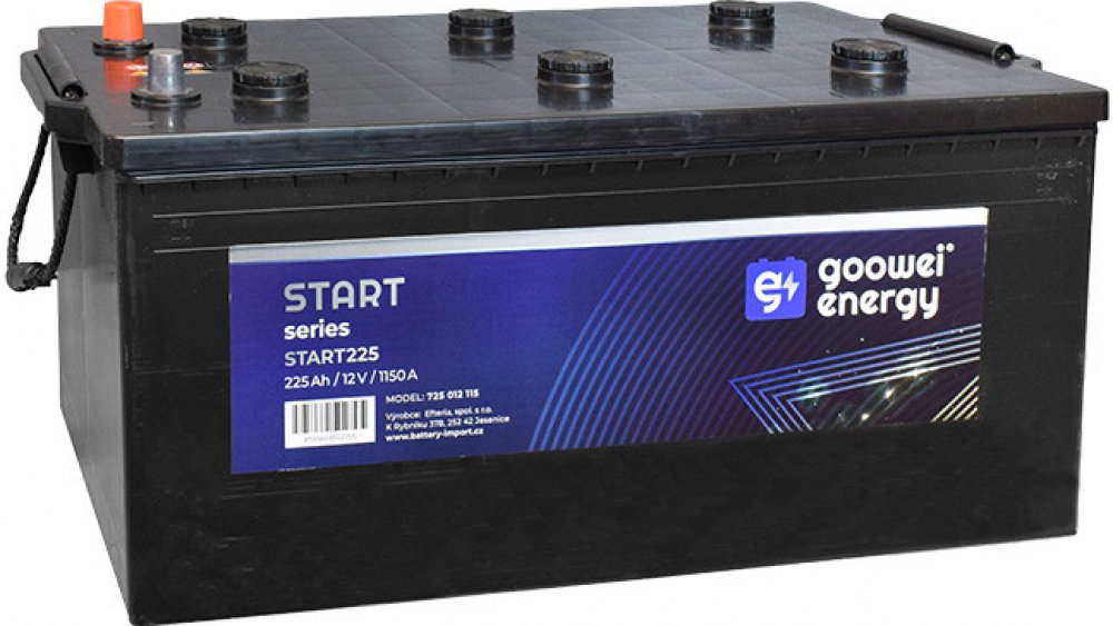 12 V 1150 A Goowei Energy 56.8 kg (+) pól vlevo 225 Ah Ca/Ca B00 242 mm 276 mm 518 mm START225 pro nákladní a užitkové vozy vhodné pro domácí montáž (DIY) s horními póly (top post)