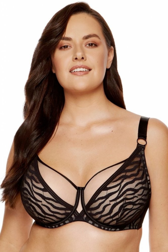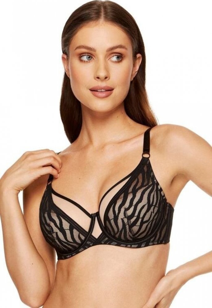 Polovyztužená podprsenka Serena má padnoucí střih, zvířecí vzor a elegantní černé provedení. Podprsenka je vyrobená z přizpůsobivého materiálu, který je velice příjemný na omak. Má kostice a polovyztužené košíčky. Zapíná se na zádech pomocí háčků. Má béžovo-černou barvu. Ramínka jsou neodepínací. Hodí se ke sladění s kalhotkami Serena.
