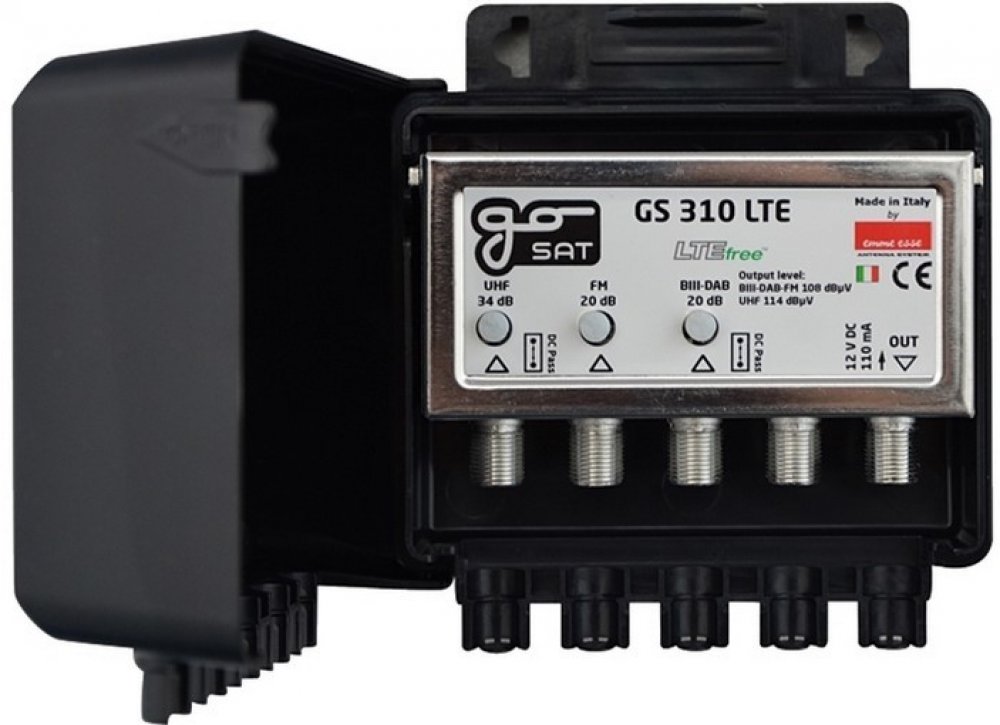 GoSAT GS310 LTE je tří vstupový stožárový zesilovač vyráběný SMT technologií v novém vylepšeném designu, zvýšenou odolností proti povětrnostním vlivům a zvýšenou odolností proti rozkmitání. Zesilovač byl navržen tak, aby splňoval všechny požadavky na příjem digitálního televizního signálu v souladu s platnými směrnicemi CE. Zesilovač je vhodný pro montáž do vnitřního i venkovního prostředí. Jednotlivé vstupy VKVII, DAB a UHF mají samostatnou regulaci zesílení odporovými trimry, napájení zesilovače +12V je realizováno dálkově po koaxiálním kabelu přes výstup, u vstupů DAB a UHF lze zapnout napájení pro předzesilovače +12V pomocí propojek (jampr's). Zesilovač má dobrou linearitu na celém zesilovaném pásmu a vynikající poměr signál/šum. Dobrá výstupní úroveň zaručuje kvalitní distribúciu signálu. Plastový kryt zesilovače zaručuje zvýšenou ochranu proti povětrnostním podmínkám a je přizpůsoben jak k montáži na stožár (max. průměr cca 55mm pomocí FeZn třmenu se závity M4) tak i na stěnu, vstupy a výstupy jsou na F-konektory.