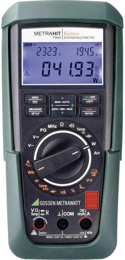 Profesionální digitální multimetr TRMS s měřením výkonu. Digitální 3-segmentový displej s rozlišením 60 000 digitů. Funkce multimetru: napětí a proud (DC a TRMS-AC a AC+DC), frekvence, odpor, diody, teplota, výkon, energie a power quality, datalogger a IR rozhraní. CAT IV 600 V·Digitální 3-segmentový displej·Měření skutečné efektivní hodnoty (TRMS) 3 bezpečnostní měřící kabely s 4mm senzory, 1000 V CAT III, 600 V CAT IV · 2 baterie 1,5 V, typ AA · Stručný návod · CD ROM s návodem k obsluze · Kalibrační certifikát DKD · Ochranné gumové pouzdro. Multimetr digitální Gossen Metrawatt METRAHIT Energy M249A Kalibrováno podle DAkkS od výrobce Gossen Metrawatt v kategorii Nářadí|Měřicí technika|Multimetry. Kupujte špičkovou kvalitu za akční ceny na Conrad.cz!