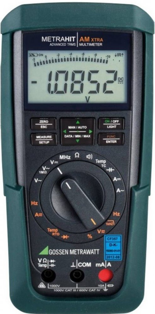 Multimetr generace Starline jsou robustní a spolehlivé digitální multimetry s pevným, odolným, plastovým pouzdrem. Přístroje se vyznačují dokonalou technikou jako např. 3 pouzdra s automatickým blokováním (ABS), TRMS měření do 20 KHz s měření teploty s termočlánkem typu K (navíc Pt100/Pt1000 u X-tra), a také podsvícený displej s velkými číslicemi. Měření teploty s typem K a s odporovým čidlem Pt100(0)·TrueRMS rozsah pásma 20 KHz·Připojitelný filtr spodní propusti 1 KHz/-3 dB·Měření frekvence a klíčovacího poměru u signálů 2 - 5 V až do 1 MHz·Datová paměť (4 MB) a interní hodiny·Zdířka pro síťový adaptér·Obousměrné infračervené rozhraní Měření teploty s odporovým čidlem Pt100(0) · Širokorozsahové měření kapacity · Měření frekvence a klíčovacího poměru u signálů 2 - 5 V až 1 MHz · Datová paměť a interní hodiny · Zdířka pro síťový adaptér · Obousměrné infračervené rozhraní k přenosu dat z PC. Sada bezpečnostních měřících kabelů · 2 x AA baterie · Návod k obsluze · CD-ROM s demo-softwarem · Kalibrační list DKD · Gumové ochranné pouzdro. Multimetr digitální Gossen Metrawatt METRAHIT X-TRA M240A kalibrováno dle DAkkS od výrobce Gossen Metrawatt v kategorii Nářadí|Měřicí technika|Multimetry. Kupujte špičkovou kvalitu za akční ceny na Conrad.cz!