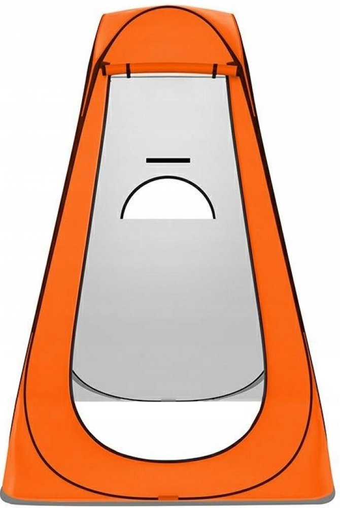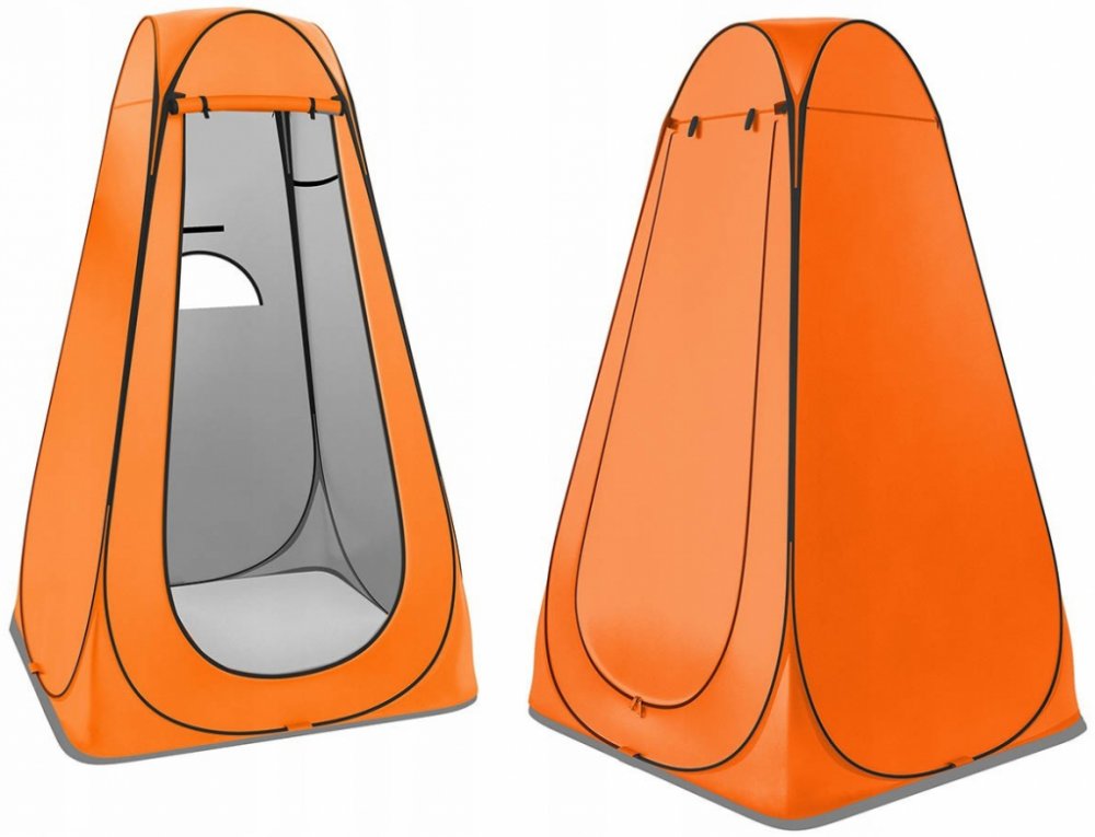 Samorozkládací stan určený k použití jako převlékárna, sprcha nebo turistická toaleta, vybavený dvěma okénky a střechou zapínanou na zip.