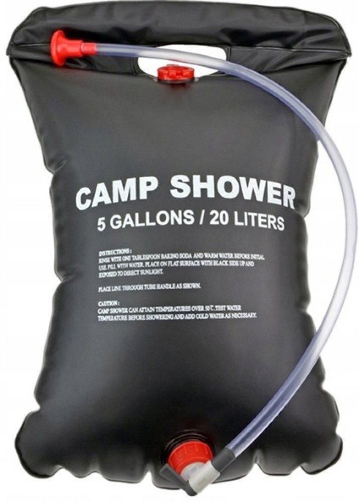 Přenosná solární kempinková sprcha 20LPřenosná solární sprcha ideální pro kempování a výlety.Díky použití slunečního světla ohřívá vodu až na přibližně 50 stupňů! Snadno se používá, má robustní držák, který vám umožní zavěsit sprchu kdekoli! Trubka je zakončena sítkem!Sadaobsahuje : - šňůrku s háčkem- trubku pro zesílení rukojeti vaku- hadici zakončenou sítkem- ventil pro regulaci průtoku vodyVlastnosti:- Kompaktní velikost.- Integrovaná, velmi praktická rukojeť- Perfektní pro letní výlety- Šířka v rozloženém stavu: asi 40cm- Délka v rozloženém stavu: asi 60 cm - Kapacita 20L