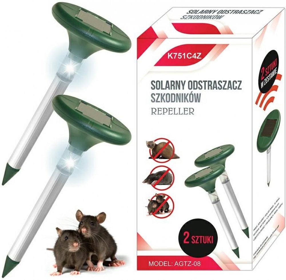 Sada obsahuje 2 odpuzovače. Solární odpuzovač škůdců využívá principu vibrace ultrazvukových vln: odpuzovač vysílá ultrazvukové vlny s frekvenčním rozsahem 400 - 1000 Hz, neslyšitelné pro lidi a domácí mazlí čky. Ultrazvukové vlny v tomto frekvenčním rozsahu dráždí sluchové orgány a nervový systém běžných škůdců, jako jsou krtci. Každých 40 sekund zařízení vysílá ultrazvukové vlny, které způsobují vibrace v horní vrstvě půdy. Takto se uvolňují generované impulsy. Vybaveno solárním panelem pro přeměnu slunečního světla na energii uloženou ve vestavěných bateriích. Umístění zařízení na nejslunnějších místech určuje jeho optimální provoz. Pro nejlepší výsledky se doporučuje nainstalovat odpuzovače 20 metrů od sebe. Vlastnosti produktu: - 2 odpuzovače na sadu - vestavěné baterie 1,2V 600mAh solární panel - solární panel: 9 x 6 cm - efektivní provozní plocha: přibližně 1000 m2. - výška cca 37 cm - průměr: hřídel - 3 cm, horní část - 15 cm - materiál: plast + kovový kolík - LED osvětlení + soumrakový senzor - vydává zvuk + vibrace každých 40 sekund - nezávadné pro lidi a zvířata Množství na palě : 336
