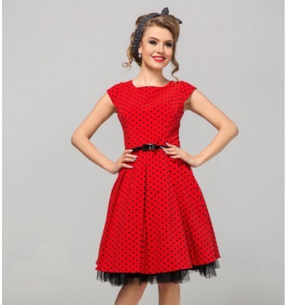 Dámské šaty s puntíky na červeném podkladu ve stylu retro jsou ušity z příjemného a kvalitního materiálu. V zadní části mají skrytý zip pro snadné oblékání. V pase mají pásek v černé barvě, který je součástí.