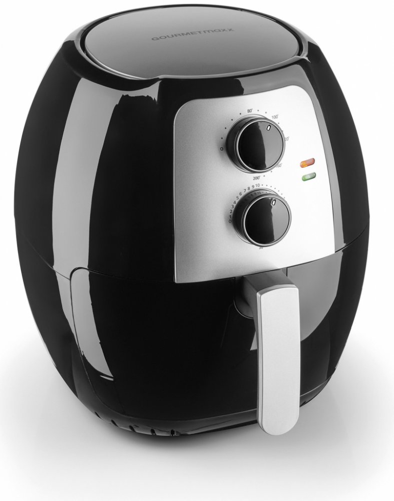 GOURMETmaxx Horkovzdušná fritéza Xxl, 12 l, 1 800 W Kombinace horkovzdušné trouby, grilu a fritézy 12 přednastavených programů: hranolky, steaky/kotlety, ryby, krevety, pizza, kuře, pečení; rotační gril, sušení; ohřívání; předehřívání a rozmrazování Smažení s nízkým množstvím tuku s cirkulací horkého vzduchu Mimořádně velký objem cca 12 l až pro cca 1,8 kg křupavých hranolků Ovládání pomocí dotykového displeje: zobrazuje programy, dobu vaření a další ukazatele Objem: cca 12 l Technické údaje Příkon: 1 800 W Rozměry cca 31 x 32,5 x 41 cm Hmotnost cca 7,48 kg