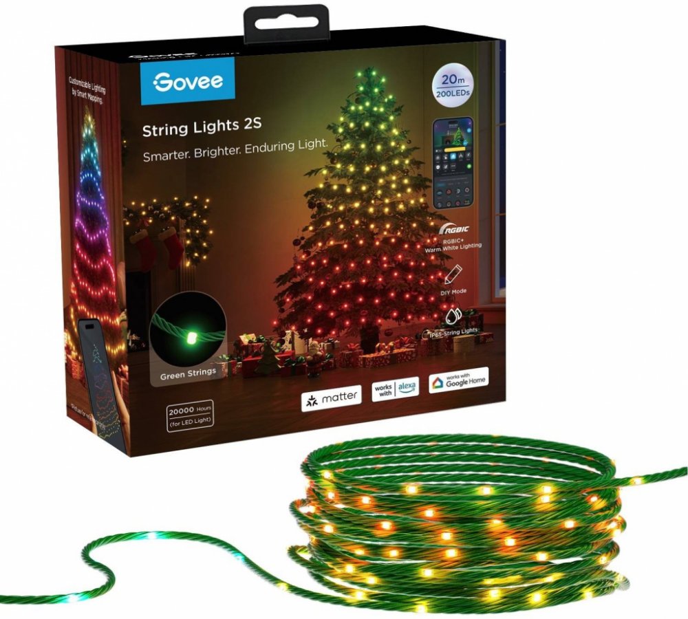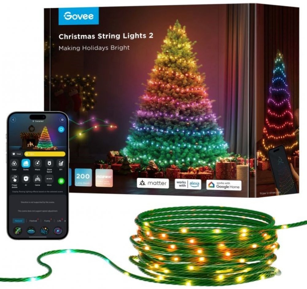 Govee RGBW osvětlení pro vánoční stromek 20m Matter Govee Vánoční světelný řetěz o délce 20 metrů je ideální volbou pro všechny, kteří chtějí vytvořit dokonalou vánoční atmosféru doma i venku. Díky své délce pokryje tento řetěz větší plochy, ať už jde o vánoční stromek, plot, nebo jakoukoli jinou dekoraci. Vybavený pokročilou RGBICW technologií, umožňuje současně zobrazovat více barev na různých částech řetězu, což vytváří plynulé přechody a dynamické efekty, které vnesou do vašich svátečních dekorací život a kouzlo. Zásadní vlastností je možnost použití AI při generování vlastních scén pomocí hlasu, textu nebo obrázků.Jednou z klíčových výhod tohoto světelného řetězu je jeho kompatibilita s Matter protokolem, což vám umožňuje bezproblémovou integraci s chytrými zařízeními ve vaší domácnosti. Řetěz je snadno ovladatelný pomocí aplikace Govee Home nebo hlasových asistentů, jako jsou Amazon Alexa a Google Assistant. Kromě ovládání můžete vybírat z více než 64 dynamických světelných scén, a dokonce si vytvářet vlastní návrhy pomocí DIY režimu, který přizpůsobí osvětlení přesně vašim představám.Stejně jako u ostatních Govee produktů, i tento řetěz nabízí hudební synchronizaci, která dokáže přizpůsobit světelné efekty rytmu vaší oblíbené hudby. Díky vodotěsnému provedení a odolnosti vůči venkovním podmínkám můžete světelný řetěz bez obav použít venku i za nepříznivého počasí. Govee Vánoční světelný řetěz kombinuje technologii, styl a jednoduché ovládání, což z něj činí dokonalého společníka pro každou sváteční sezónu. Představení: https://youtu.be/9uG5kmsCdZkAI genrované scény: https://youtu.be/63uRFRMParQInstrukce pro mapování barev na světelný řetěz: https://youtu.be/8tHF9QwoaNg Hlavní vlastnosti: Vhodné na Vánoce, Valentýna, Velikonoce nebo jiné slavnostní příležitosti Ovládání přes aplikaci Govee Home přes Bluetooth nebo WiFi, Protokol Matter Ovládání hlasem – Siri, Google Assistant, Alexa 16 milionů barev – technologie RGBICW zobrazuje až 57 barev najednou Bílé diody pro perfektní podání bílé barvy Synchronizace s hudbou přes integrovaný mikrofon Jednoduchá instalace a životnost 50.000 hodin Použití v interiéru i exteriéru Stupeň krytí světel IP65 (zdrojový adaptér IP44 není vodotěsný) Provozní teplota je -10°C až 40°C RGBICW diody pro plné spektrum barev Govee Vánoční světelný řetěz, které nabízejí nejen pestrou škálu barevných kombinací, ale také teplé a studené bílé odstíny pro ještě větší flexibilitu při vytváření atmosféry. Tato technologie umožňuje současné zobrazení více barev na různých částech řetězu, což vytváří plynulé přechody a dynamické efekty, ideální pro vánoční dekorace i každodenní osvětlení. Díky teplým bílým tónům můžete dosáhnout tradičního a útulného vzhledu, zatímco jasné barvy oživí váš prostor energickými světelnými vzory. RGBICW diody nabízejí bezkonkurenční možnosti přizpůsobení, ať už preferujete jemné a elegantní osvětlení, nebo živé a pulzující efekty. AI generovaný kontent Govee Vánoční světelný řetěz přináší inovativní možnost generování barev a efektů pomocí umělé inteligence, což uživatelům umožňuje snadno vytvářet jedinečné a personalizované osvětlení. Stačí zadat požadované barvy nebo nahrát obrázek a lampa automaticky vygeneruje odpovídající barevné schéma a efekty, které ladí s vaší představou. Tato technologie otevírá nekonečné možnosti pro kreativitu, ať už plánujete vánoční výzdobu, oslavu nebo chcete osvěžit každodenní atmosféru ve svém domově. S možností AI generování barev a efektů se vaše osvětlení stává živým a interaktivním prvkem vašeho prostoru. Mnoho scén pro každou příležitost Govee Vánoční světelný řetěz nabízí více než 130 přednastavených světelných scén, které jsou perfektní pro vánoční sezónu i další festivaly během roku. Tyto scénické režimy zahrnují pestrou škálu efektů, od tradičních a útulných atmosfér po živé a energické barevné kombinace, které dokáží oživit jakoukoli oslavu. Ať už slavíte Vánoce, Nový rok, Halloween nebo jiné speciální příležitosti, vždy najdete tu pravou scénu, která dokonale ladí s vaší náladou a tématem události. S těmito bohatými možnostmi přizpůsobení se váš prostor stává centrem zábavy a radosti pro rodinu a přátele. DIY režim pro realizaci vlastních návrhů Govee Vánoční světelný řetěz nabízí kreativní DIY režim, který vám umožňuje navrhovat vlastní světelné scény přesně podle vašich představ. Pomocí aplikace Govee Home můžete snadno upravit barvy, intenzitu a efekty, což vám dává plnou kontrolu nad tím, jak bude váš řetěz vypadat. Tento režim vám umožňuje vytvořit jedinečné a osobité světelné vzory, které dokonale odpovídají vaší náladě nebo tématu. Ať už chcete zachytit tradiční vánoční atmosféru nebo experimentovat s moderními barevnými kombinacemi, DIY mód je ideální pro realizaci vaší kreativity a přizpůsobení osvětlení tak, jak si přejete. Mnoho možností ovládání Govee Vánoční světelný řetěz nabízí široké možnosti ovládání, které zahrnují jak tradiční metody, tak moderní technologie pro maximální pohodlí. Je plně kompatibilní s Matter protokolem, což zajišťuje bezproblémovou integraci s platformami jako HomeKit a dalšími chytrými domácími systémy. Můžete jej ovládat prostřednictvím aplikace Govee Home, hlasových asistentů jako Amazon Alexa a Google Assistant, nebo pomocí dotykového ovládání, což vám poskytuje flexibilitu při přizpůsobení osvětlení.