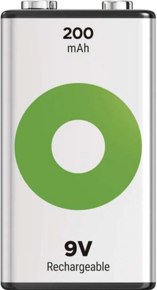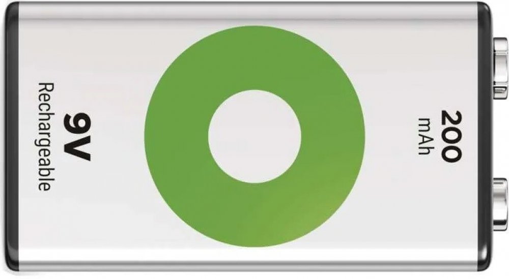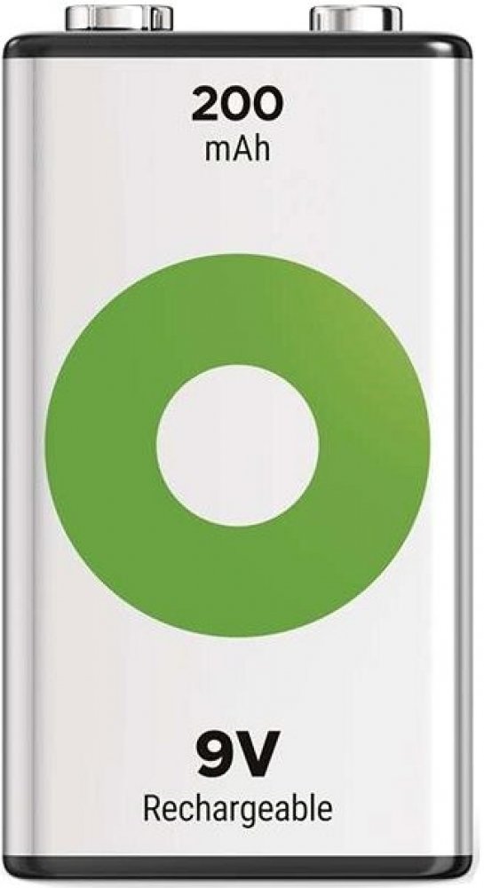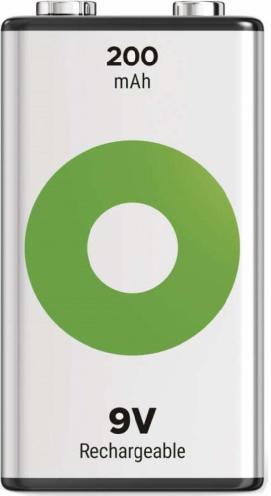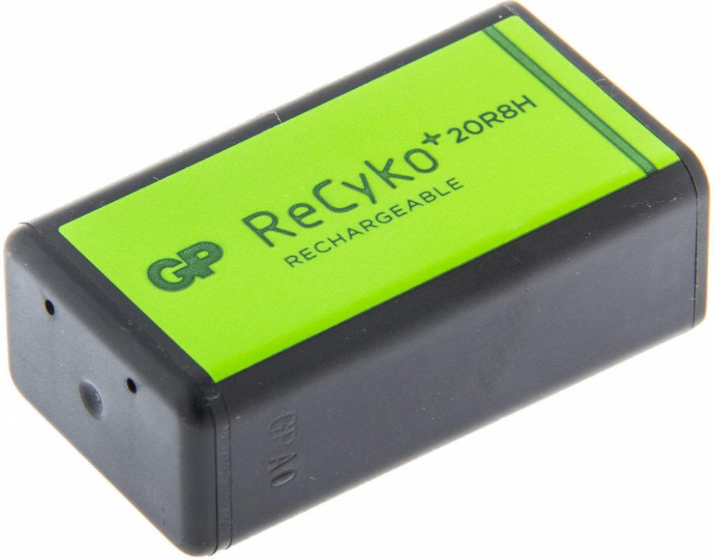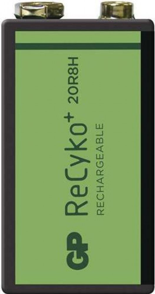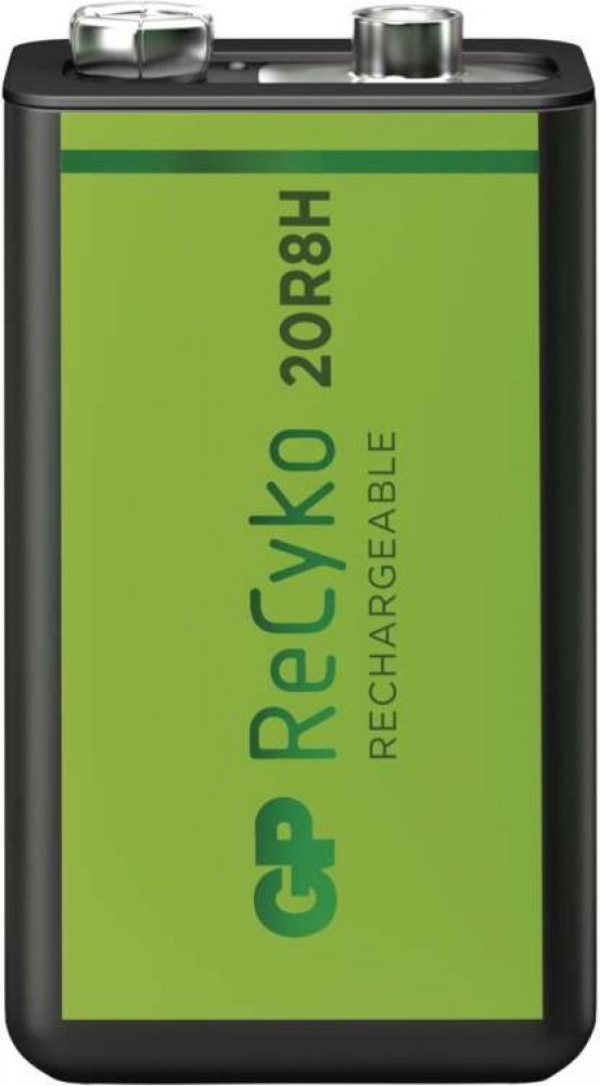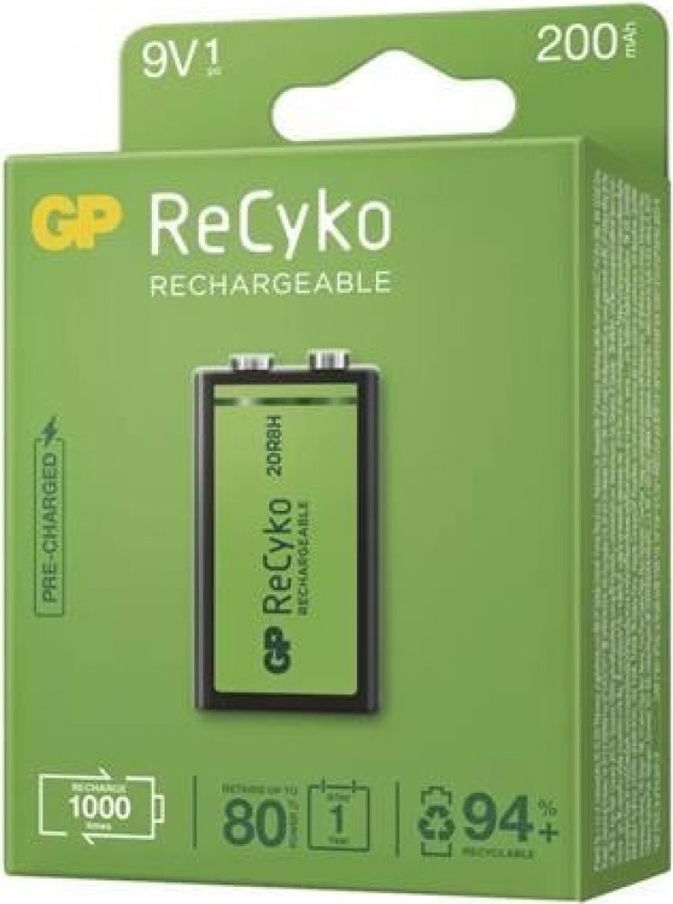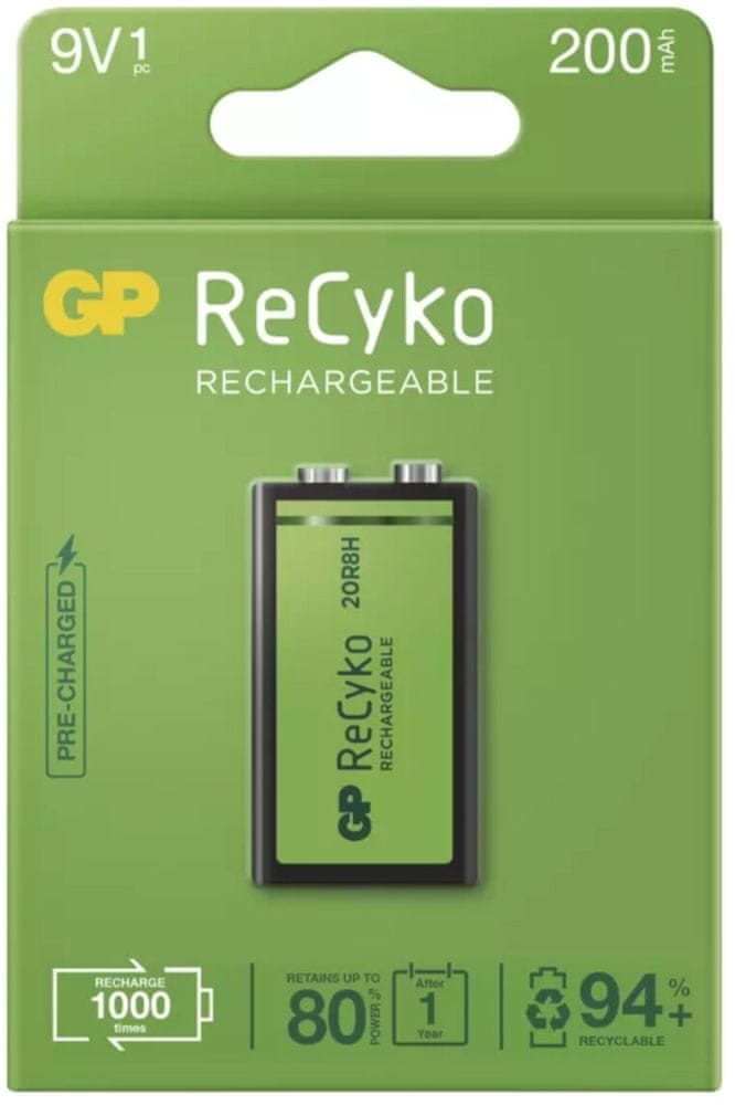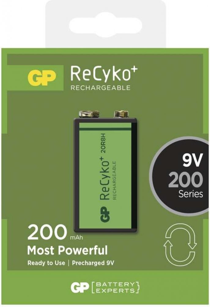 Nabíjecí NiMH baterie GP ReCyko+ s kapacitou 200 mAh, velikost 6F22 (9V). Více než 500 nabíjecích cyklů.