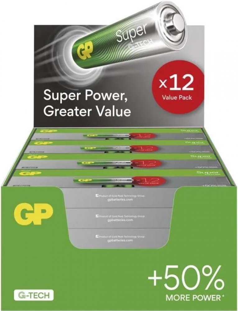 Vylepšená řada GP alkalických baterií SUPER přináší nárůst výkonu a nepřetržitého provozu až o 50 % oproti ostatním běžným alkalickým bateriím, čímž jsou ideální volbou pro dlouhé chvíle strávené s rodinou a další aktivity, které vyžadují spolehlivý zdroj energie.