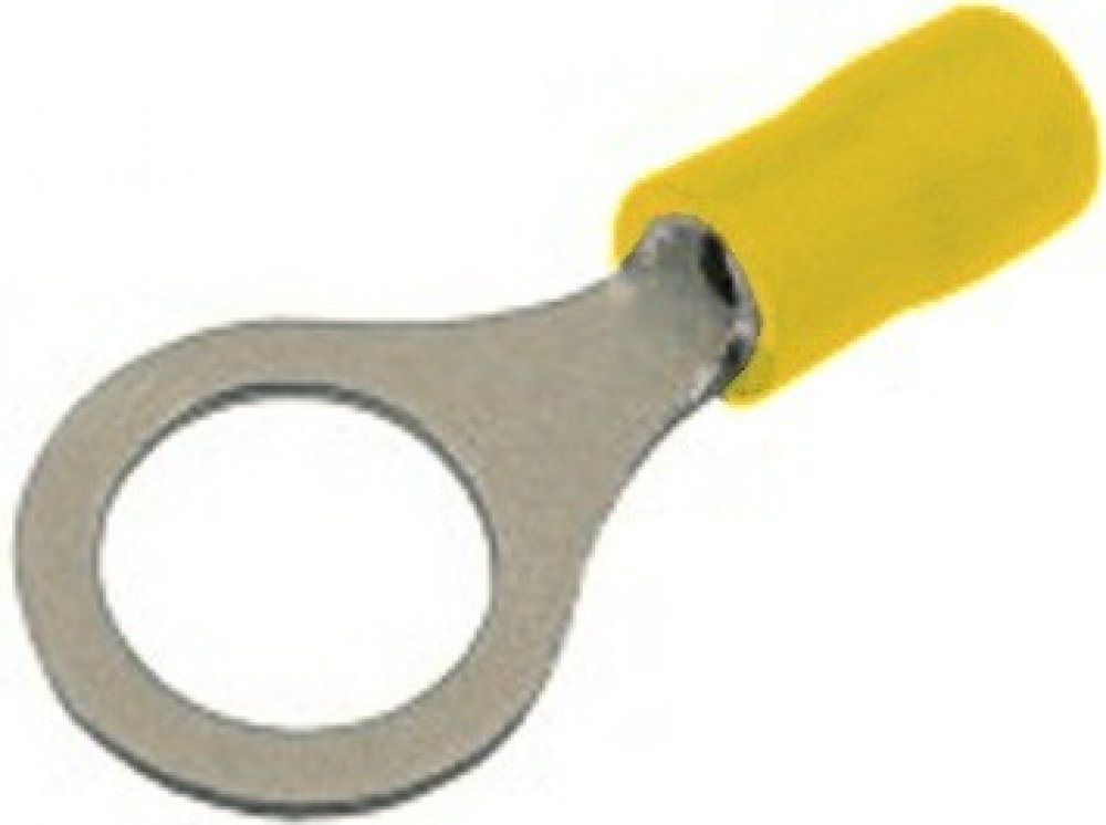 Žluté lisovací kabelové očko GPH GF-M10 k zakončení kabelů, pro průřez 4 - 6 mm2, svorník M10. Do konektoru faston očka vložíme oholený vodič a pomocí Faston kleští spojku secvakneme.
