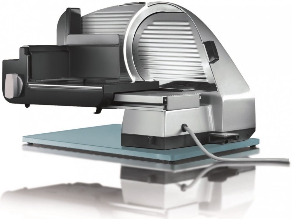 Kráječ má elegantní nadčasový design a extrémně tichý chod. Jeho konstrukce zaručuje maximální robustnost, stabilitu a dlouhou životnost. Celokovová konstrukce je doplněná základovou deskou z tvrzeného skla, což umocňuje elegantní vzhled a přináší výhody při čištění stroje. Díky protiskluzovým nožičkám je kráječ velmi stabilní.