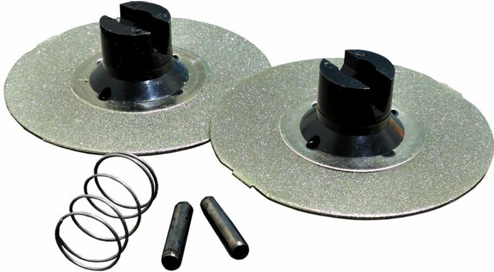 Obsah setu: dvojice ostřících kotoučků, dvojice zajišťovacích čepů (pro zajištění kotoučku na hřídeli motoru), náhradní pružinka mezi kotoučky.