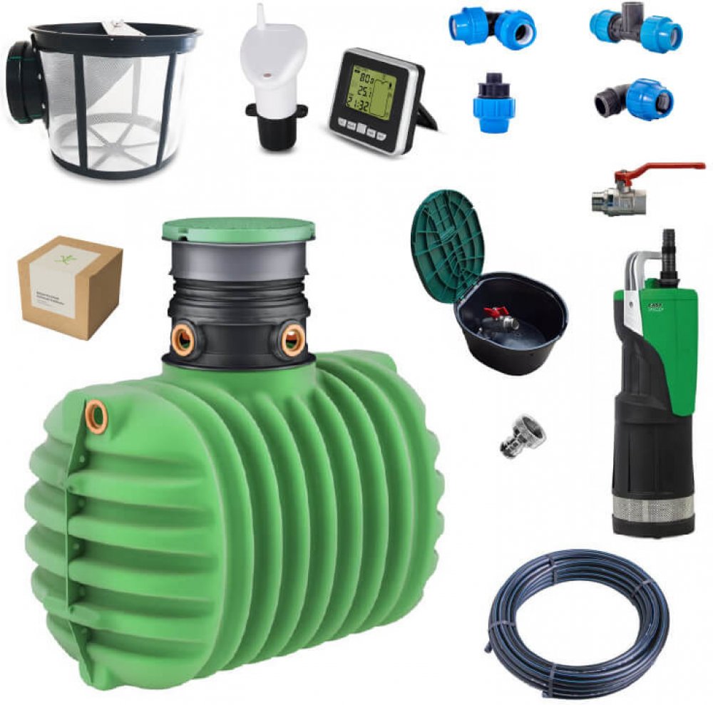 Kompletní sestava pro hospodaření s dešťovou vodou na zahradě.