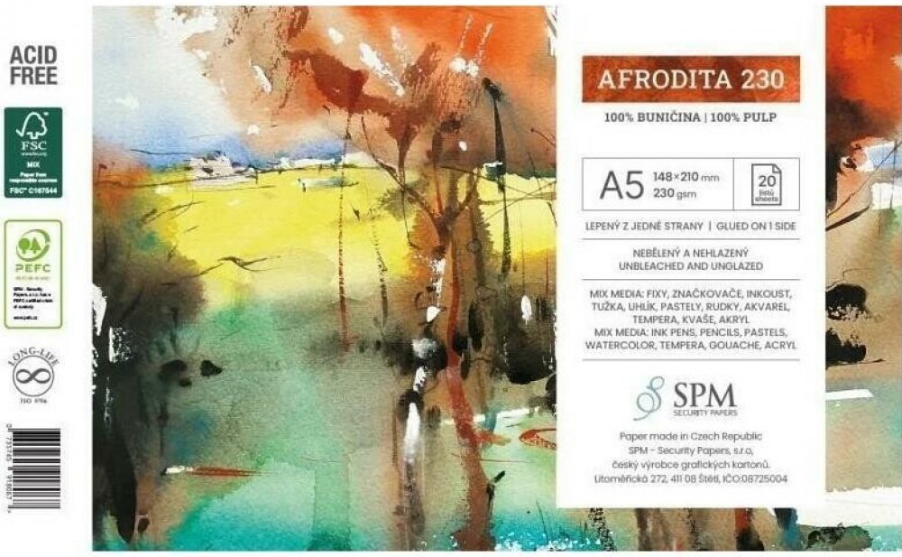 Akvarelový blok Afrodita - A5, 230g/m2, 20 listů Blok české výroby, určený pro akvarelovou (mokrou i suchou) techniku malování a kreslení. Karton v bloku je klížený, má 100% buničinový původ a přírodní barvu. Povrch je nehlazený. Vhodný pro: akvarel, akryl, temperu, pastel, uhel. Lepená vazba. Bez ligninu a kyselin.
