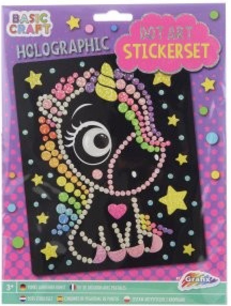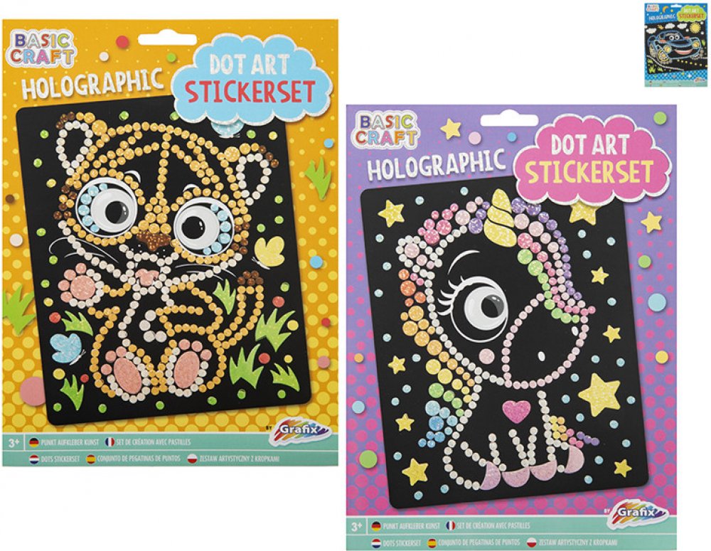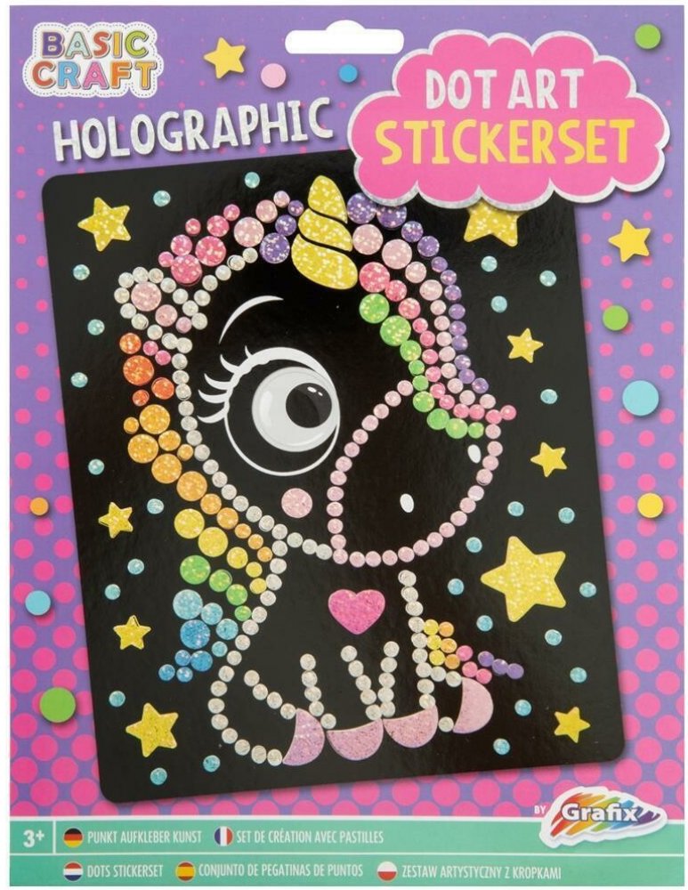 Vytvoř si vlastní mozaikový obrázek. Mozaikové obrázky GRAFIX probouzí kreativitu a nadšení a malé výtvarníky zaměstnají na dlouhé hodiny. Pomocí jednoduchého lepení pěnových tvarů a samolepek vznikají unikátní výtvory. Postup:Na obrázek postupně upevňujte barevné pěnové dílky. Dozdobte přiloženými očky a je hotovo! Fantazii se meze nekladou, obrázky nemusíte plnit podle barev, dejte jim své kouzlo a nanášejte barvy podle sebe.Obsah balení:podkladový obrázek rozměry (22 x 18 cm) arch pěnových samolepek očička Sada obsahuje předlohu s motivem zvířátka, sadu stickrů, oči k výrobě obrázku. Rozměr balení cca 20 x 25,5 x 1 cm. Věk 3+ Směs vzorů, zboží zasíláno náhodně.Sada obsahuje: sada obsahuje: 1 desku s předtištěným obrázkem a sadu samolepek různých tvarů a barev. Holografická bodová nálepka, 3 ASD. 22 x 18 cm. Nalepte holografické samolepky na arch samolepek podle vzoru a vytvořte zábavné obrázky. K dispozici je několik variant. Vhodné pro děti od 3 let. Holografické nálepky set SINGLE HORSE