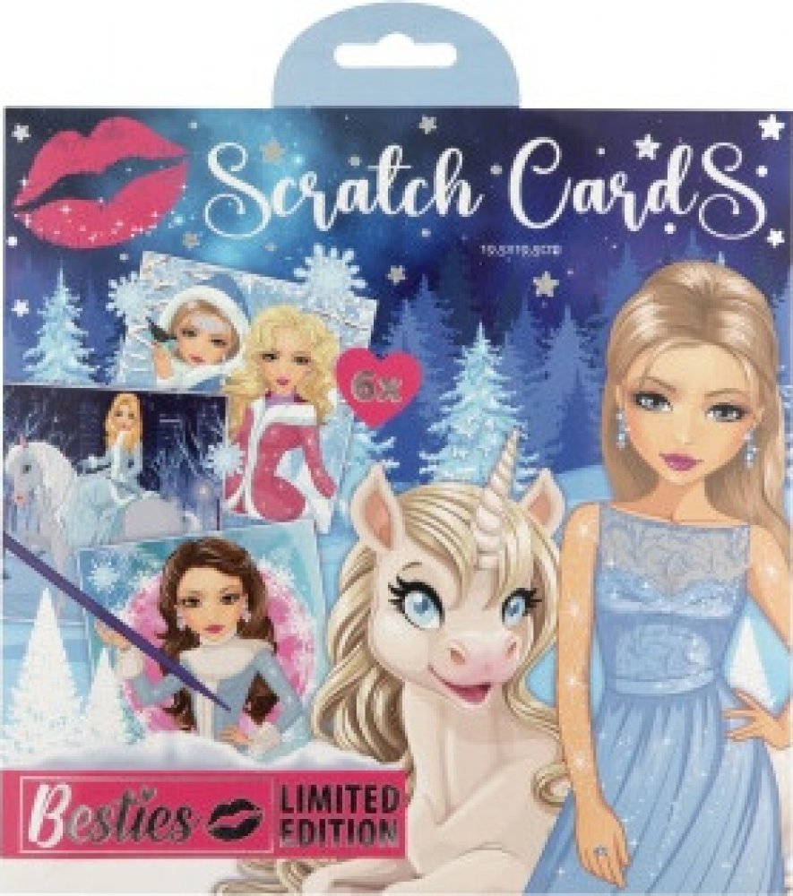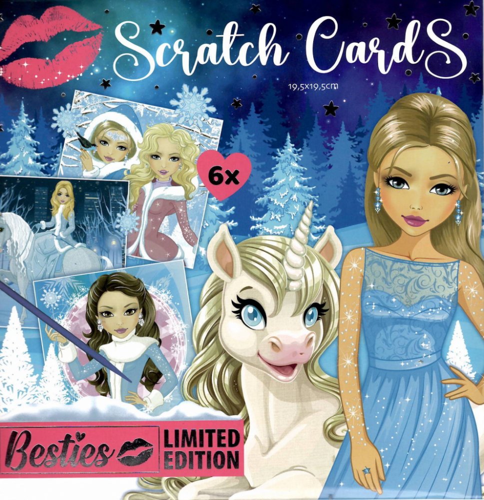 Kreativní zábava s vyškrabávacími obrázky! S touto sadou 6 obrázků Besties Scratch Cards (velikost 19,5×19,5 cm) a škrabátkem můžeš vytvářet úžasné výtvory, které ožijí pod tvýma rukama. Stačí škrábnout a pod černým povrchem se ukážou nádherné barevné motivy!