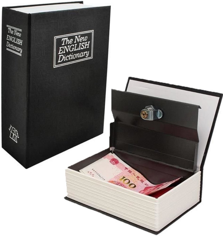 BEZPEČNÝ - SKRYTÁ KAZETA V KNIZE trezor ve tvaru knihy se zámkem Ideální do kanceláře, domu, hotelu dělá velmi dobrou kamufláž vnitřní kazeta z ocelového plechu obal vyrobený z lepenky a plastu SPECIFIKACE Černá barva vnější rozměry (délka / šířka / tloušťka): 24x15,5x5,5cm vnitřní rozměry (délka / šířka / tloušťka): 23x14,5x5cm hmotnost: 700g ZAHRNUTA rakev klíče Rakevový trezor ve tvaru knihy, anglický slovník. Skvělé na cennosti, peníze nebo doklady. Můžete v něm schovat i léky před svými dětmi. Trezor je dobře ukrytý v realisticky vyhlížejícím slovníku - knize. Ideální do kanceláře, domu, hotelu. Perfektní pro umístění na knihovnu, díky čemuž je dokonale integrovaná a nevzbuzuje podezření. Je to velmi dobrá kamufláž - vypadá jako skutečná kniha. Vnitřní pouzdro je vyrobeno z ocelového plechu, kryt je vyroben z lepenky a plastu. Uzavřeno zámkem - klíče v ceně.