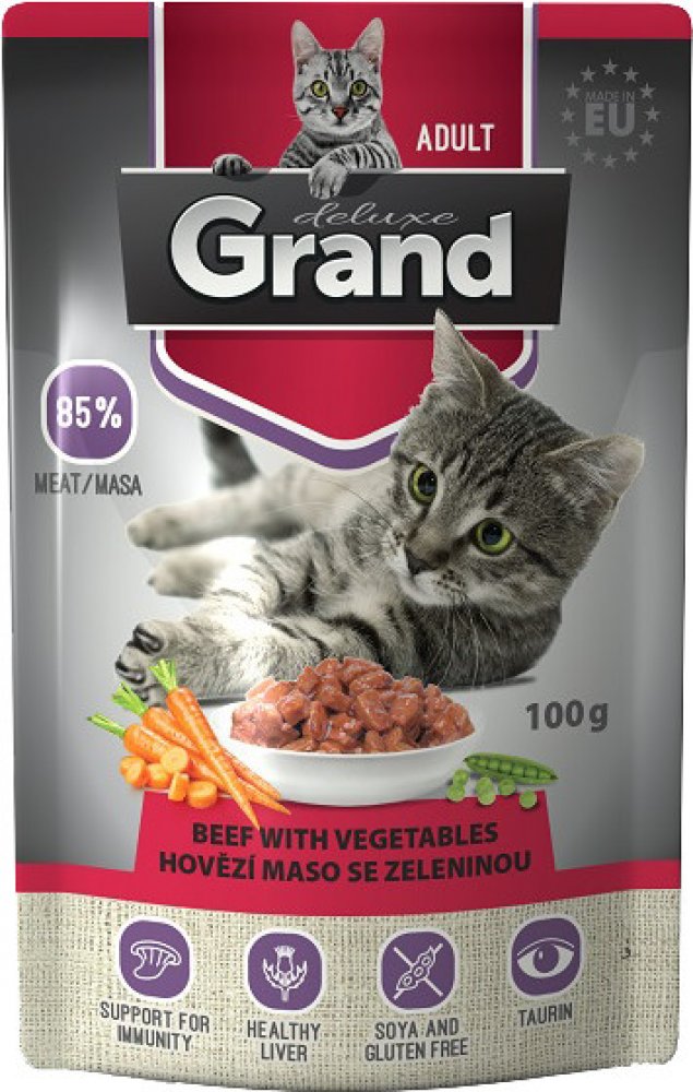 Chutná kapsička Grand Deluxe s hovězím masem a zeleninou ve vlastní šťávě potěší i náročné kočičí jazýčky. Díky šetrnému vaření v páře si maso zachovává přirozenou chuť, vůni i cenné živiny. Neobsahuje lepek, sóju, chemická aditiva ani konzervanty – ideální pro citlivé kočky. Obsažený taurin přispívá ke zdravému zraku, srdci i imunitě.