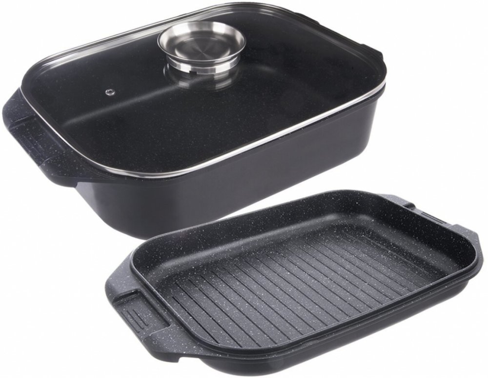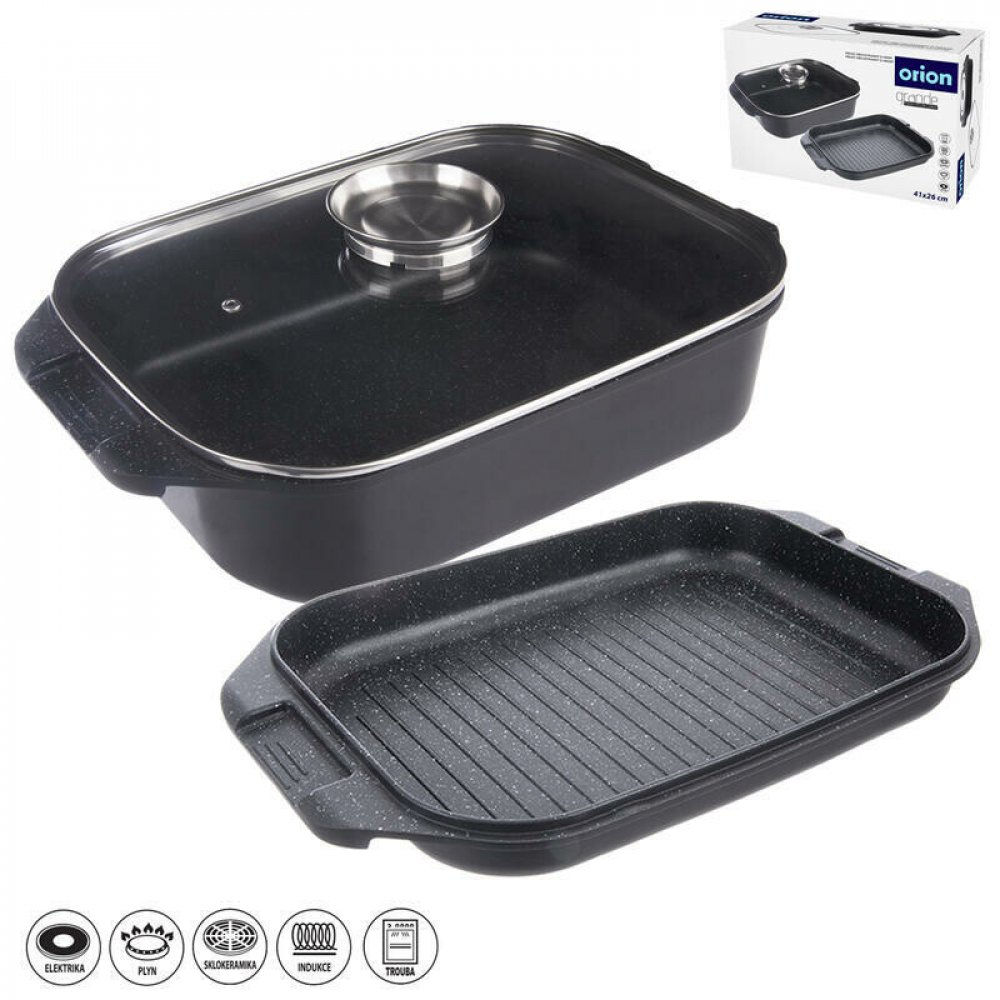 Pekáč GRANDE využijete jako klasický pekáč s víkem na přípravu masa, jako aroma hluboký pekáč s poklicí, ale i jeho díly samostatně – střední díl jako mělký pekáč nebo pánev na pečení i smažení, s profilovaným dnem (skleněná poklice není kompatibilní s touto částí pekáče). Skleněná poklice s aroma úchytem umožní jemné dávkování tekutých dochucovadel – olejů, vína… bez nutnosti odklopení poklice. Dochucovadlo nalijete do úchytu a ono samovolně protéká skrz otvor dovnitř do pekáče. Pekáč je opatřen uvnitř velmi kvalitním nepřilnavým povrchem PFLUON GRANIT ve 2 vrstvách, který Vám umožní přípravu jídel na minimálním množství tuku. Vně nepřilnavý povrch s vysoce odolným nástřikem. Díky úpravě vnějšího povrchu můžete oba díly použít na všechny typy tepelných zdrojů včetně indukce a do trouby - max. 230 °C. Materiál: slitina hliníku s povrchovou úpravou, uvnitř velmi kvalitní nepřilnavý povrch PFLUON GRANIT ve 2 vrstvách, vně nepřilnavý povrch s vysoce odolným nástřikem, skleněná poklice s nerezovou aroma nálevkou a s otvorem pro únik páry – max. do 200 °C. Výhodou je jeho lehkost a snadná manipulace. Rozměry: horní díl – vnitřní 33,5x24x4,5 cm, vnější 41x26x5 cm, spodní díl – vnitřní 34x24,5x9,5 cm, vnější 41x26x10 cm, celková výška 15 cm. Při manipulaci doporučujeme použití kuchyňských chňapek. Vhodný do ledničky, do myčky na nádobí – vlivem agresivních čisticích prostředků může dojít k nepatrné oxidaci dna – tento jev nemá vliv na proces vaření, není zdravotně závadný a nemůže být předmětem reklamace. Náhradní víko z naší nabídky 711445.
