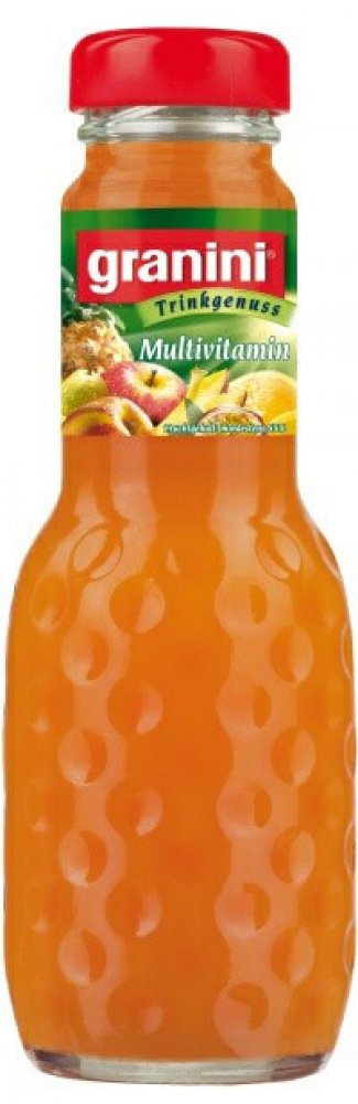 Dodáváme po 24ks. Vratné sklo 24x200ml - záloha 112Kč. To nejlepší z ovoce. Džusy a nektary granini jsou 100% přírodní, neobsahují chemické konzervanty, barviva ani sladidla. Pro svou charakteristickou láhev s dolíčky a slibem, že granini vždy používá jen to nejlepší ovoce, se jasně odlišuje od ostatních. Multiovocný nektar z koncentrátu a dřeně, obohacený 10 vitamíny. Složení: voda, ovocná šťáva z koncentrátu: jablka(17%), hrušky(11%), pomeranče(11%), marakuji(4,5%), ananasu(3%), cukr, dřeň z: banánu(1%), broskve(1%), mirabelky(0,5%), hrušky(0,5%), manga(0,5%), kyselina: kyselina citronová, vitamíny: C, B3, E, B5, B2, B6, B1, B9, biotin, B12, betakaroten. Alergeny : neuvádí se. Zboží na objednání - dodání cca do týdne.