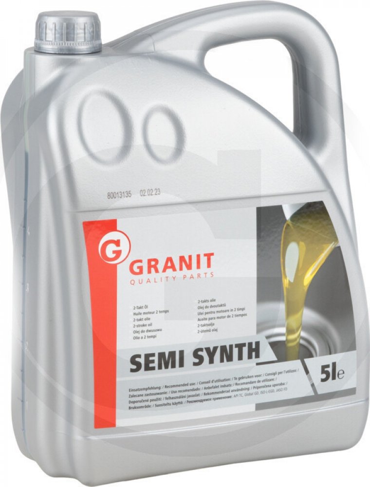 Plně syntetický dvoudobý olej GRANIT je samočinně se mísící a nízko kouřový plně syntetický dvoudobý olej vyvinutý pro vodou chlazené přívěsné motory a vzduchem chlazené dvoudobé motory se samostatným mazáním i bez něj