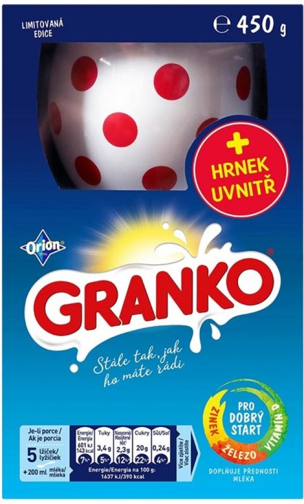 cena za 1 kg je 178.64 kčNápoj v prášku. Slazená rozpustná směs pro přípravu kakaového nápoje s přídavkem vitamínů.složení: cukr, kakaový prášek se sníženým obsahem tuku 20 %, emulgátor (sójový lecitin), jedlá sůl, vitamíny (viz tabulka), směs koření, aroma. Může obsahovat stopy mléka.Popis :Nápoj v prášku, slazená rozpustná směs pro přípravu kakaového nápoje s přídavkem vápníku a vitamínůSložení :Cukr,Kakaový prášek se sníženým obsahem tuku 20 %,Koncentrát minerálních látek z mléka,Emulgátor (sójový lecitin),Jedlá sůl,Vitamíny (viz tabulka),Směs koření,AromaAlergeny :Může obsahovat MlékoObsahuje SójaStopové prvky :Může obsahovat stopy mlékaEnergetické hodnoty :na 100gEnergetická hodnota : 1609 kJ 380 kcal,Bílkoviny : 4,9 g,Sacharidy : 79,9 g, z toho cukry : 77,9 g,Tuky : 3,2 g, z toho nasycené mastné kyseliny: 1,5 g,Vláknina : 6,6 g,Sodík : 0,11 g,Kyselina listová : 250 _g 125 %,Vitamin C : 92,0 mg 115 %,Niacin : 25,9 mg 161 %,Vitamin E : 15,5 mg 129 %,Kyselina pantoténová : 3,4 mg 57 %,Vitamin B6 : 2,4 mg 171 %,Vitamin B1: 2,3 mg 209 %,*Referenční hodnota příjmu u průměrné dospelé osobyObchodní sdělení :TAK, JAK HO MÁTE RÁDI.
