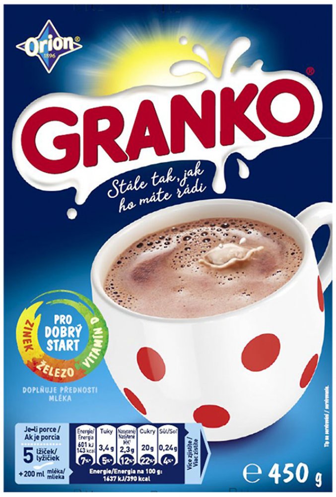 cena za 1 kg je 178.64 kčNápoj v prášku. Slazená rozpustná směs pro přípravu kakaového nápoje s přídavkem vitamínů.složení: cukr, kakaový prášek se sníženým obsahem tuku 20 %, emulgátor (sójový lecitin), jedlá sůl, vitamíny (viz tabulka), směs koření, aroma. Může obsahovat stopy mléka.Popis :Nápoj v prášku, slazená rozpustná směs pro přípravu kakaového nápoje s přídavkem vápníku a vitamínůSložení ...