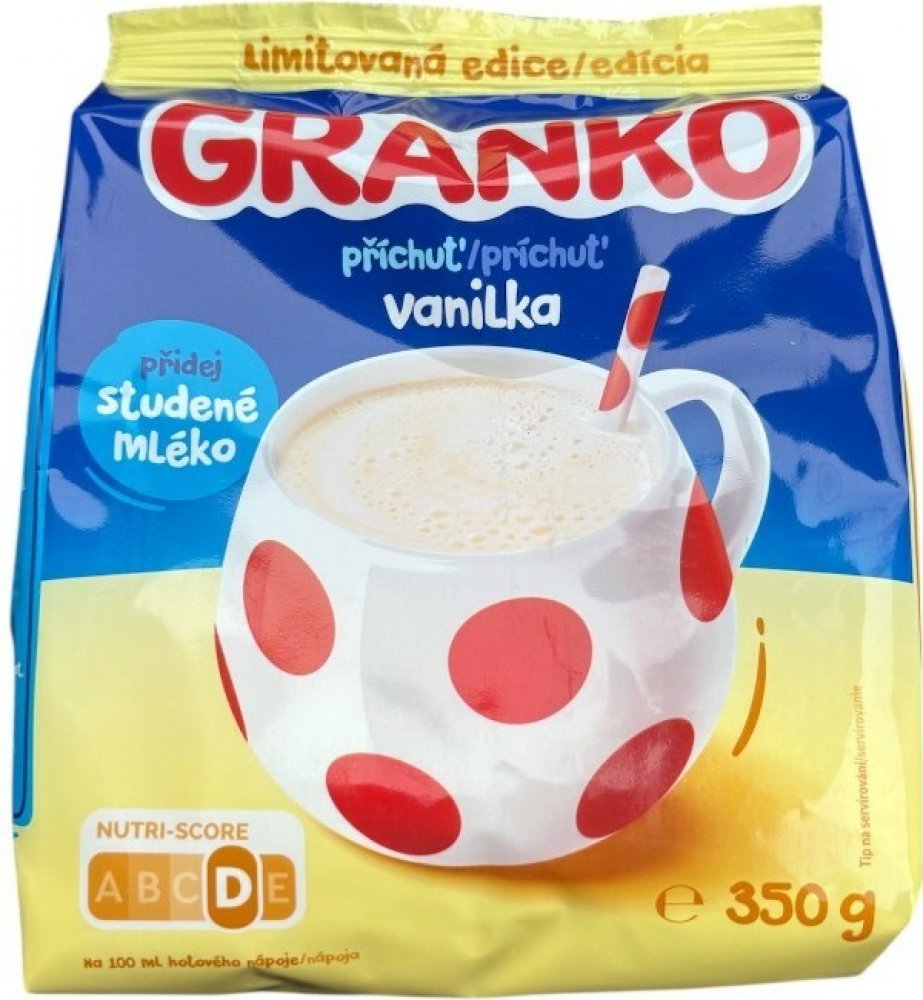 Letní limitovaná edice. Osvěžte se mléčným koktejlem GRANKO s vanilkovou příchutí. Jednoduše zamíchejte sypkou směs do studeného mléka a vychutnejte si rychlou svačinku, která ochladí i zachutná. Pro přípravu mléčného koktejlu s vanilkovou příchutí. 100% rozpustnost sypké směsi i ve studeném mléce. Nápoj v prášku - slazená rozpustná směs pro přípravu nápoje s příchutí vanilky.
