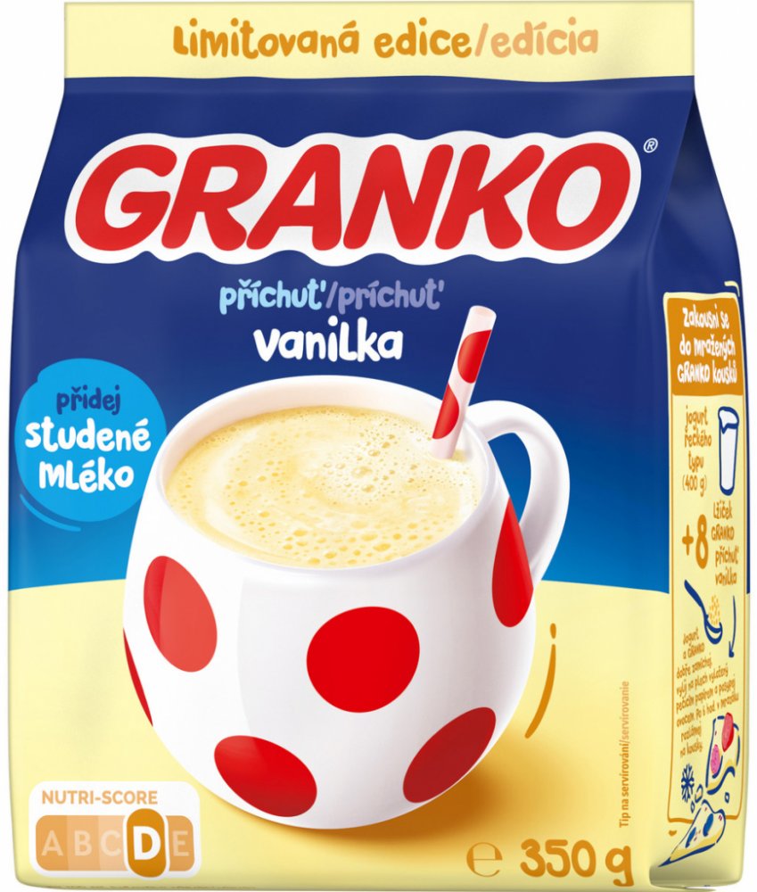Návod na přípravu: 5 lžiček GRANKO příchuť vanilka (13 g) + 200 ml polotučného studeného mléka.