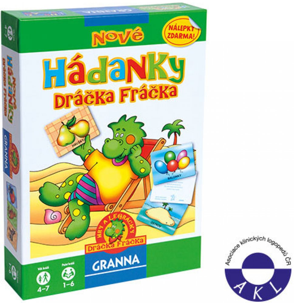 Granna Nové Hádanky Dráčka Fráčka, Po úspěchu hádanek dráčka Fráčka přináší řada HRY A LEGRÁCKY DRÁČKA FRÁČKA jejich pokračování. Nové hádanky dráčka Fráčka jsou opět určeny pro 1 až 6 dětí ve věku od 4 do 7 let. Hra obsahuje kartičky s veršovanými hádankami na jedné a tajenkou v podobě obrázku na druhé straně. Dospělá osoba nebo dítě, které umí číst, přečte hráči hádanku z kartičky. Pokud na ni h...