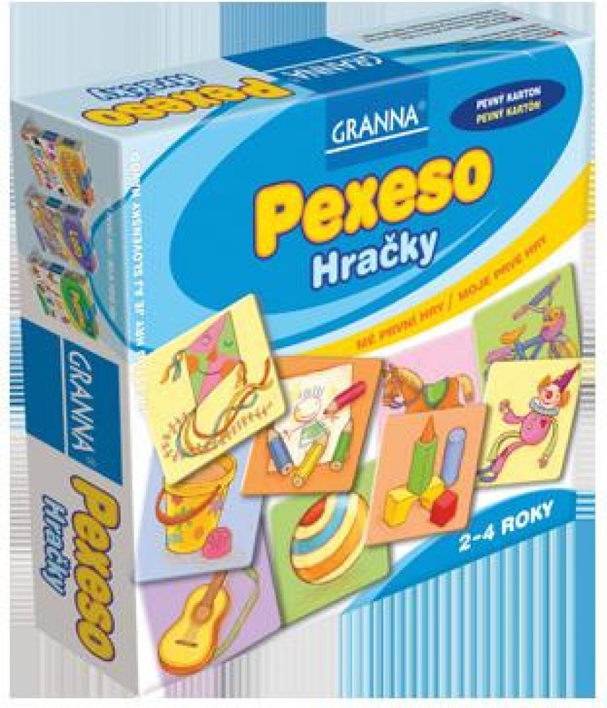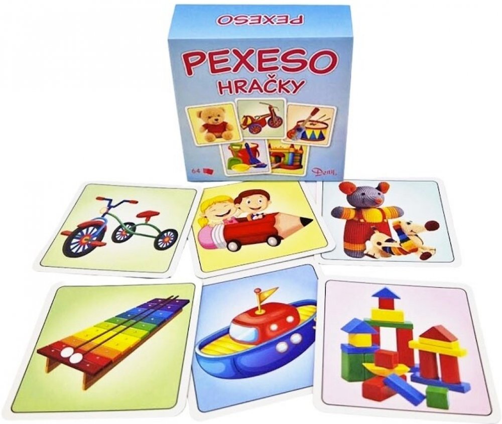 Moje první pexeso! Otočím dva obrázky. Na jednom je autíčko a na druhém je také autíčko. Hurá! Čtyřiadvacet kartiček ze zvlášť odolného pevného kartonu přináší motivy, jež jsou dětem nejbližší – hračky. Hra rozvíjí jemnou motoriku, pozorovací i kombinační schopnosti, procvičuje paměť a schopnost soustředění a zároveň rozšiřuje slovní zásobu.