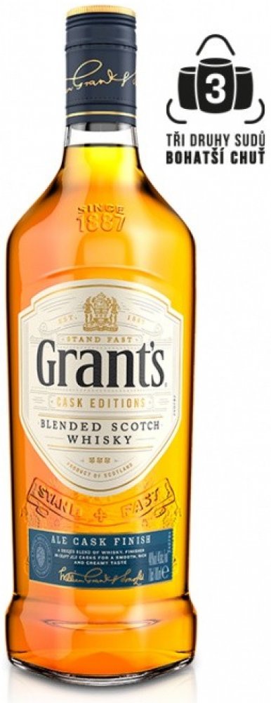 Barva: Jantarová Aroma: Svěží sladová, tóny květu bezu a vřesu Chuť: Cítíme javorový sirup, červená jablka a med Zrání Jelikož má whisky a pivo shodné chuťové profily, Master Blender z lihovaru Grant's požádal místní skotský pivovar, aby nechal v sudech po bourbonu dozrávat jejich piva ALE. Výsledkem je hladký, bohatý a krémový Grant's Ale Cask Finish. Příběh Grant’s je značka míchané skotské whis...