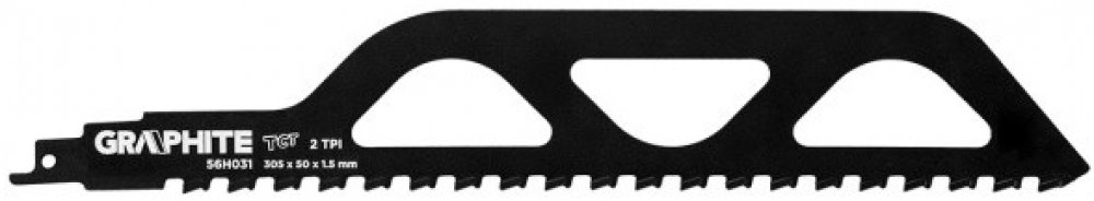 Pilový kotouč šavlový, HM, 305 x 50 x 1,5 mm, 2TPI, rozteč zubů 12,7 mm. Vhodné pro středně velké cihly (do 215 mm - poroton, vláknocement, pórobeton, červené cihly). Šavlový pilový list GRAPHITE o délce 305 mm a 2 zuby na palec se používá k řezání pórobetonu, cihel, cementových desek a sádrokartonu šavlovými pilami. Maximální tloušťka materiálů je 215 mm. Používá se při renovačních, stavebních a demoličních pracích i při domácích amatérských pracích. Umožňuje přímé řezy. Pilový kotouč způsobuje při řezání méně prachu než tradiční metody. Umožňuje řezat blízko okrajů a v těžko přístupných místech.zuby 2TPI (carbid) vhodné na červené cihly, ytong do síly 215mm