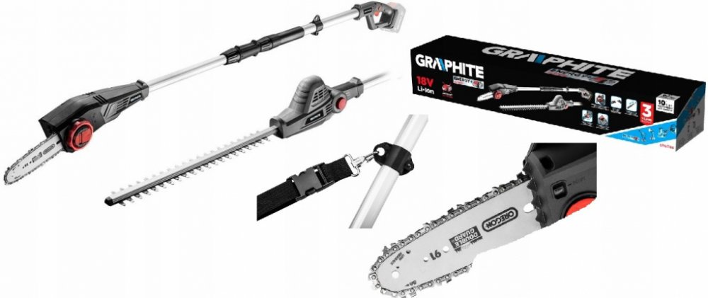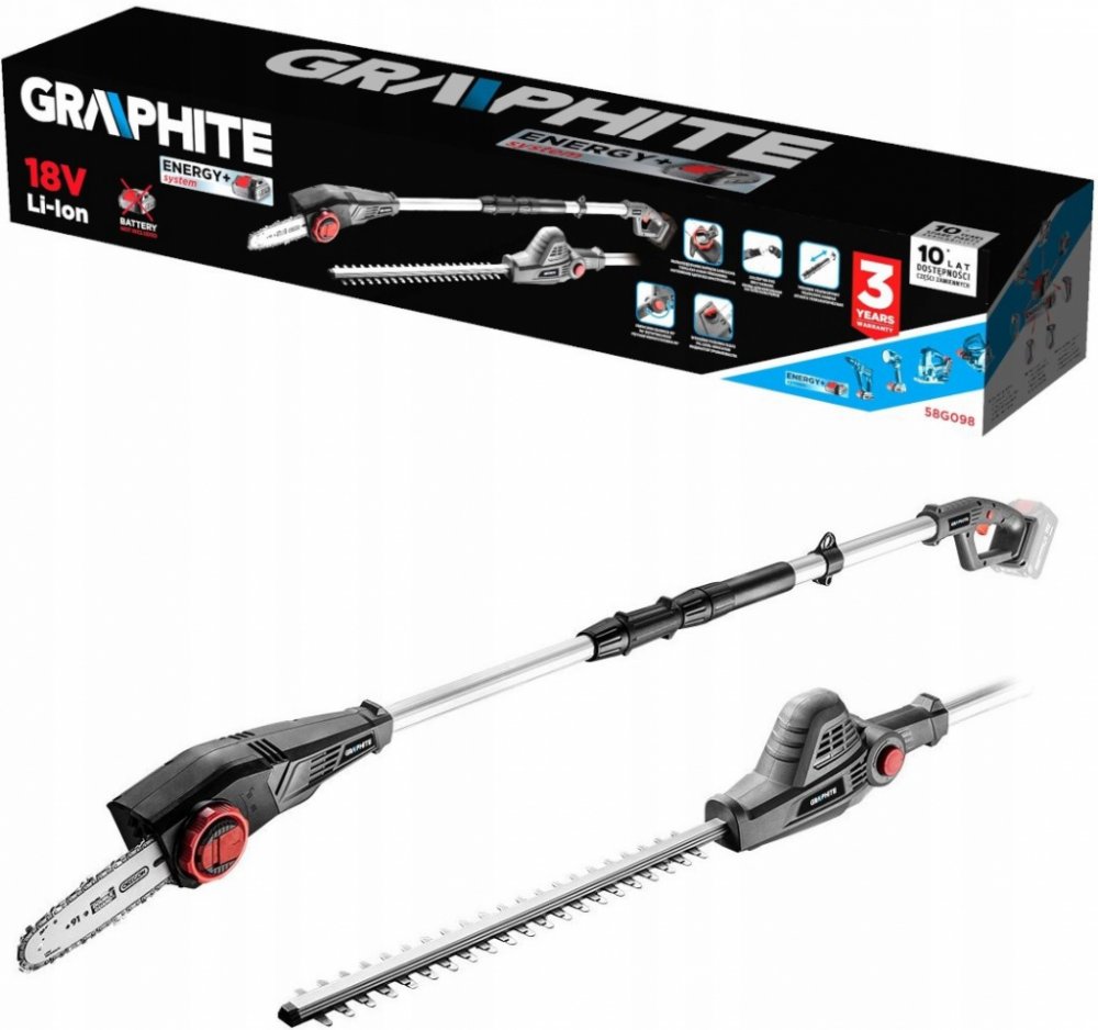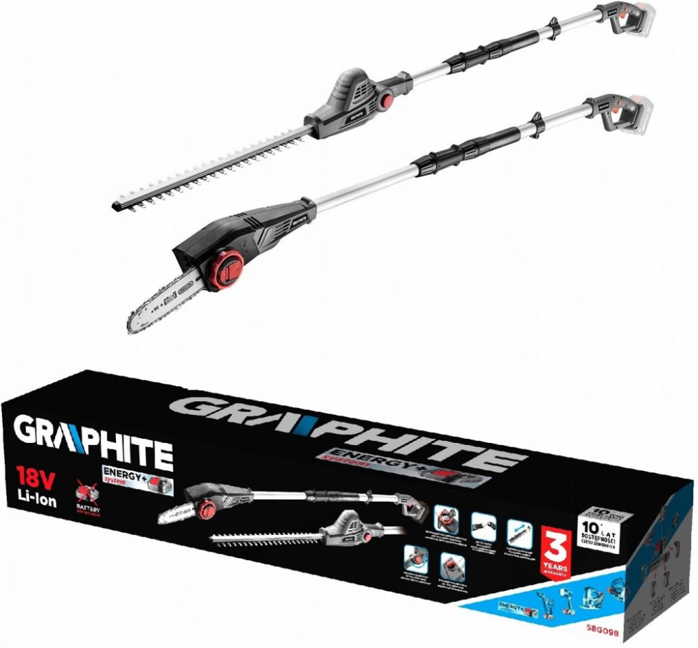 Zahradní teleskopické nářadí 2v1 – řetězová pila a nůžky na živý plot ze série Energy+ 18V GRAPHITE