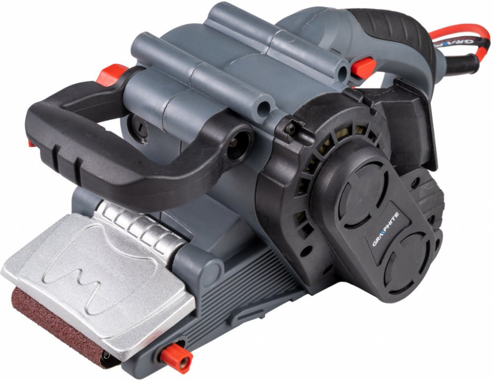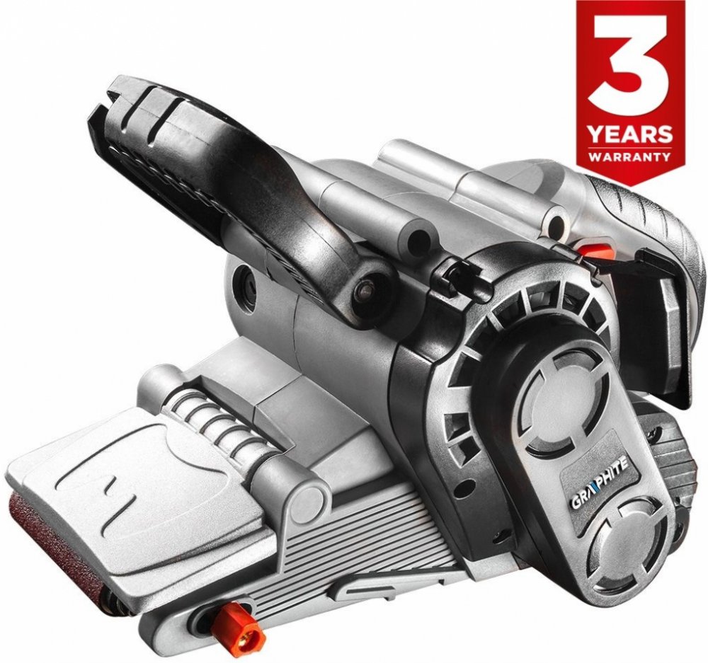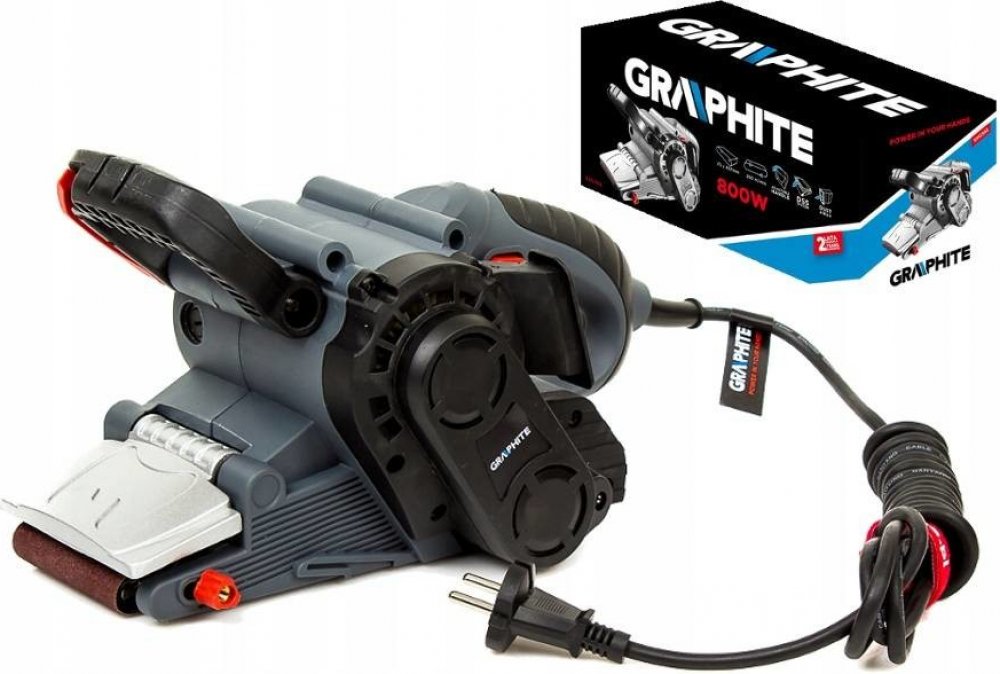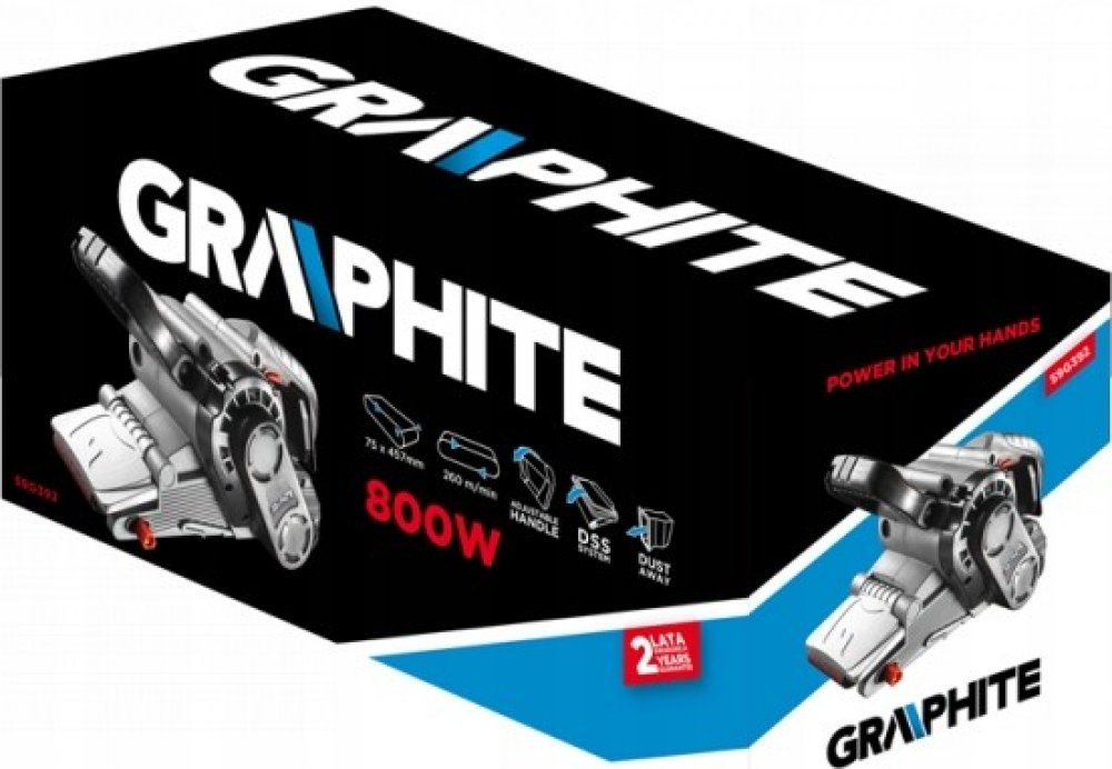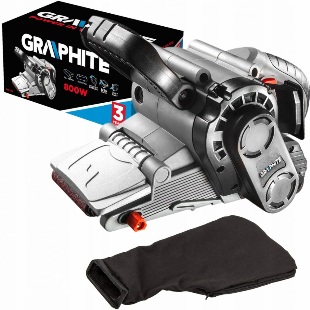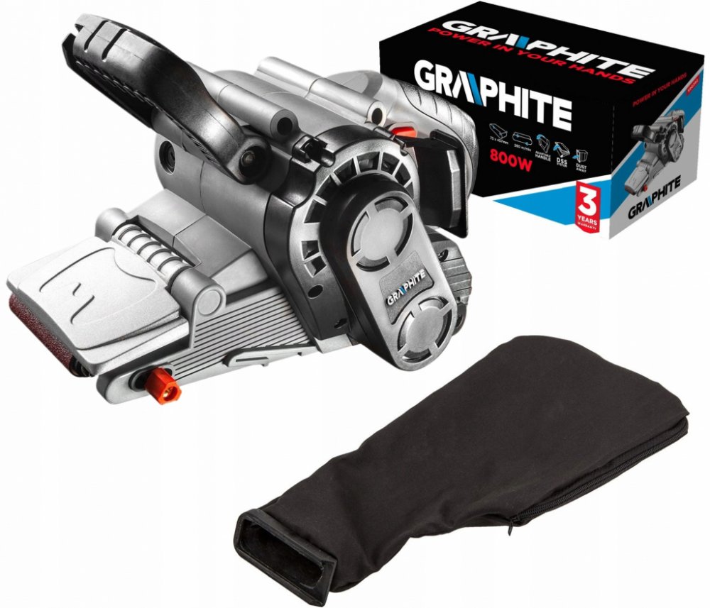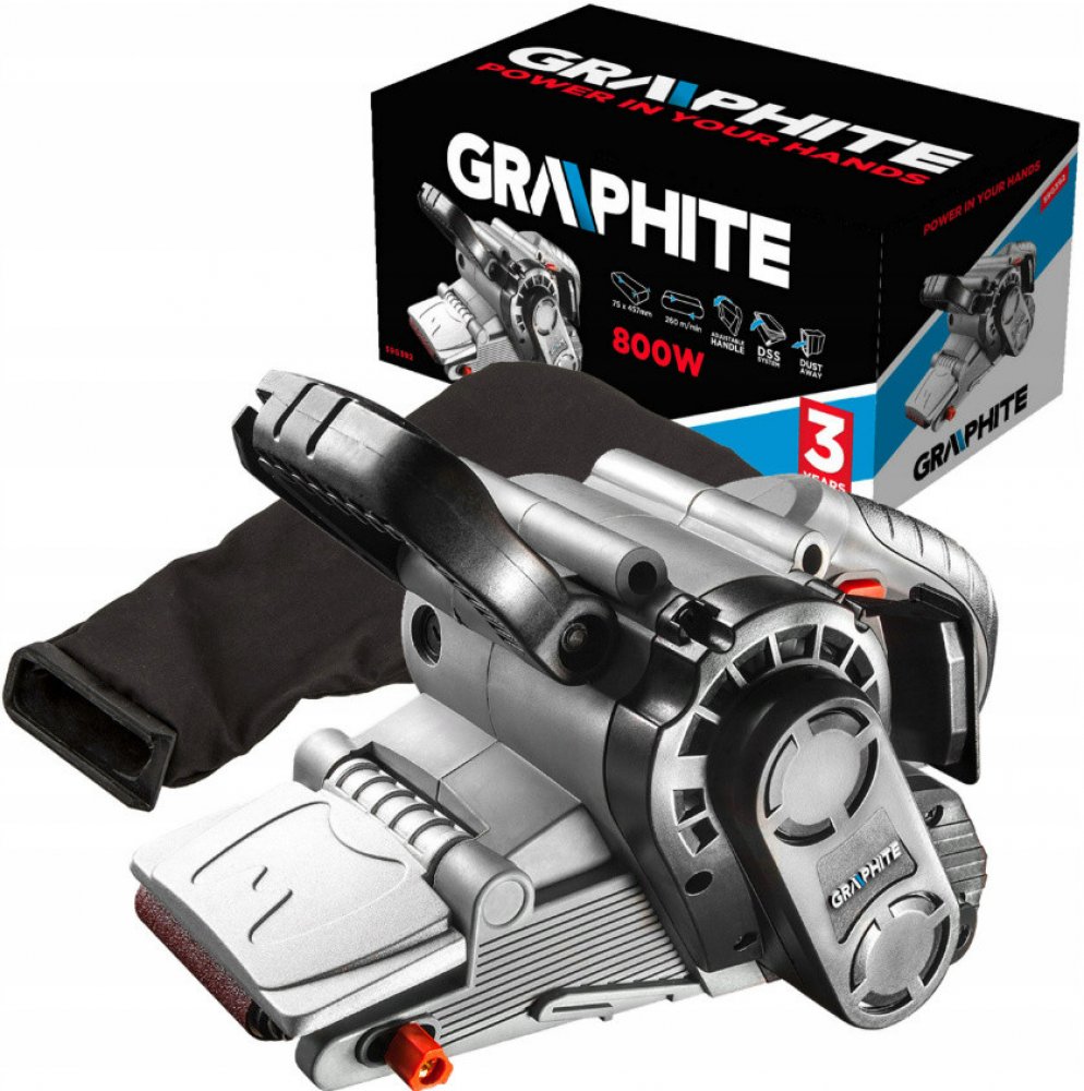 Pásová bruska 800 W, nekonečný pás 75 x 457 mm, rychlost pásu 260 m/min, aktivní brusná plocha 75 x 146 mm, průměr vodicího válečku 16 mm, (D x V) 300 x 140 mm, hmotnost 3,1 kg, příslušenství: brusný pás, prachový sáček. Speciální pásová bruska GRAPHITE s výkonem 800 W pro obrábění dřevěných materiálů, materiálů na bázi dřeva, kovů a plastů. Zařízení se vyznačuje ergonomickým tvarem a moderním vzorem, a je vybaveno hlavní rukojetí s protiskluzovým obložením a pomocnou rukojetí s možností rychlého nastavení požadovaného úhlu. Vodící řemenice brusky je vyrobena ze slitiny hliníku odolné proti vysokým teplotám a poškození. Malý průměr přední řemenice (16,5 mm) umožňuje broušení v těžko přístupných místech. Možnost aretace spínače v poloze pro nepřetržitý provoz a odklonění krytu nekonečného brusného pásu. Maximální rychlost brusného pásu je 260 metrů za minutu. Zařízení je vybaveno pružným a odolným napájecím kabelem v 3-metrovém gumovém povlaku, určeném k profesionálnímu a průmyslovému použití jak uvnitř, tak i vně místností. Bruska se dodává spolu s prachovým vakem a nekonečným brusným pásem o rozměrech 75 x 457 mm. Soulad s evropskými standardy zaručuje certifikát CE.