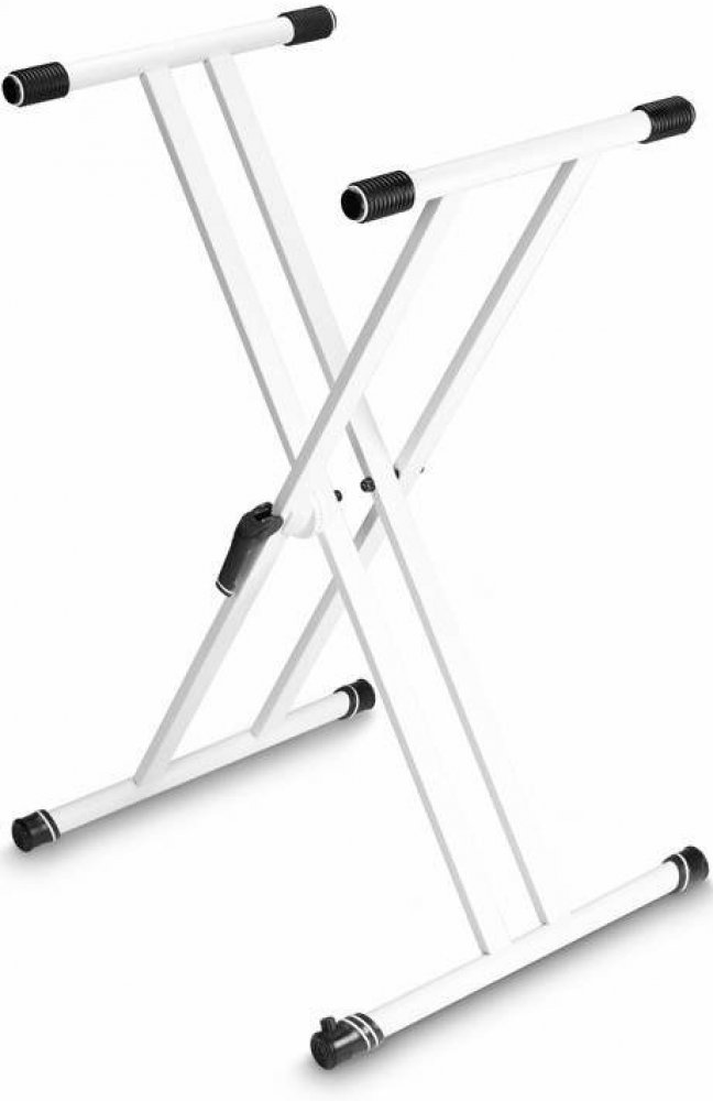 klávesový stojan bílý, s možností rozšíření Standardní skládatelný stojan pro klávesy s konstrukcí ve tvaru X a dvojitým zpevněním. Výškové nastavení stojanu je pohodlné a jednoduché a zajišťuje ho středový kloub s bezpečným systémem zamykání. Stojan je vyroben z oceli s pogumovanými nožičkami. Maximální šířka stojanu je 400 mm. Stojan umožňuje výškové nastavení v rozmezí od 100 do 900 mm.