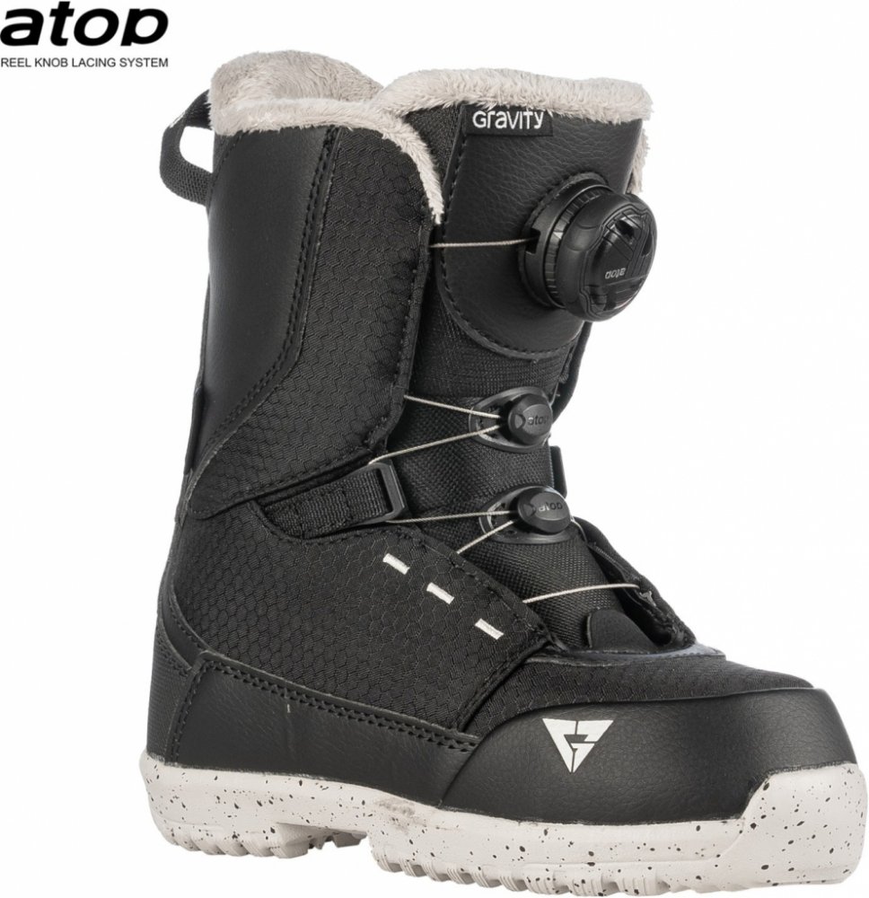 Gravity Micro jsou lehoučké dětské boty na snowboard pro nejmenší jezdce a jezdkyně, se systémem utahování pomocí Atop kolečka. Jsou navržené pro snadné obouvání a rychlé zvládnutí základů snowboardingu - taky díky lehčímu utahování. Jsou opatřeny lehkou EVA podrážkou a nemají samostatnou vnitřní botičku, tím pádem váží ještě méně a utahování je ještě jednodušší.
