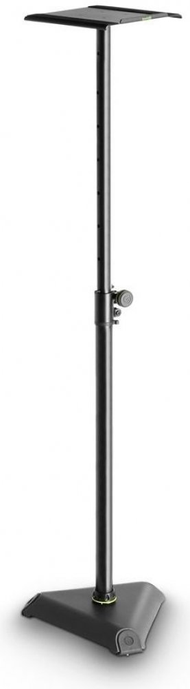 Stojan na monitor/reproduktor, má pevnou trojúhelníkovou základnu z litiny a ocelový základ 25 x 25 cm s izolační pěnou. Má nastavitelnou výšku od 90 do 150 cm pro optimální umístění reproduktorů a je dodáváno se sadou hrotů, které se montují na velké integrované gumové nožičky, pro akustickou vazbu vůči podlaze. Nosnost 50 kg. V černém barevném provedení.
